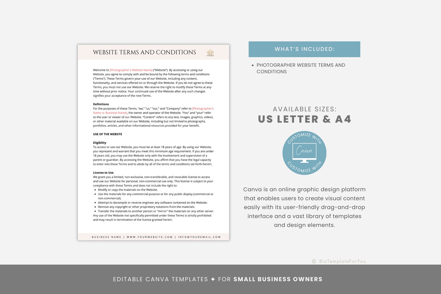 Editable Photographer Website Terms and Conditions Template, Photography Website Policy, Photographer Website Rules, Canva editable #6090