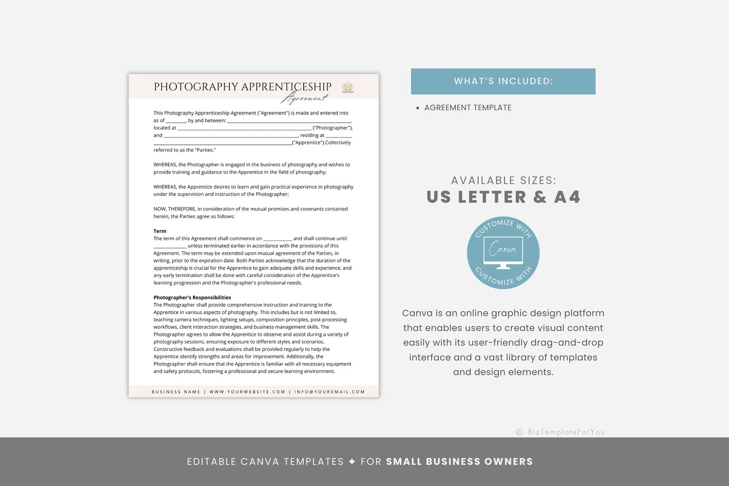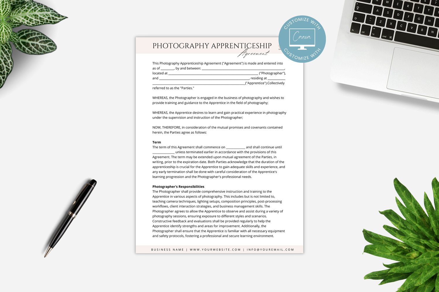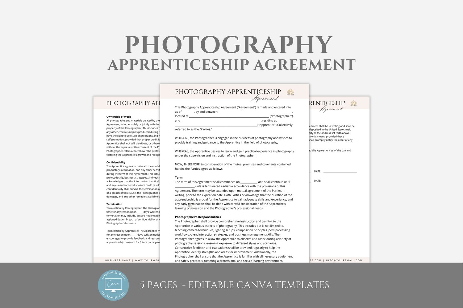This is a 5-page Photography Apprenticeship Agreement editable in Canva (FREE Account)! The text is already written for you, but it can also be easily edited in CANVA to add anything particular to your business or area. It is also completely customizable. Text, font, and colors are all fully editable to give you complete control of your branding and create a cohesive look for your business.