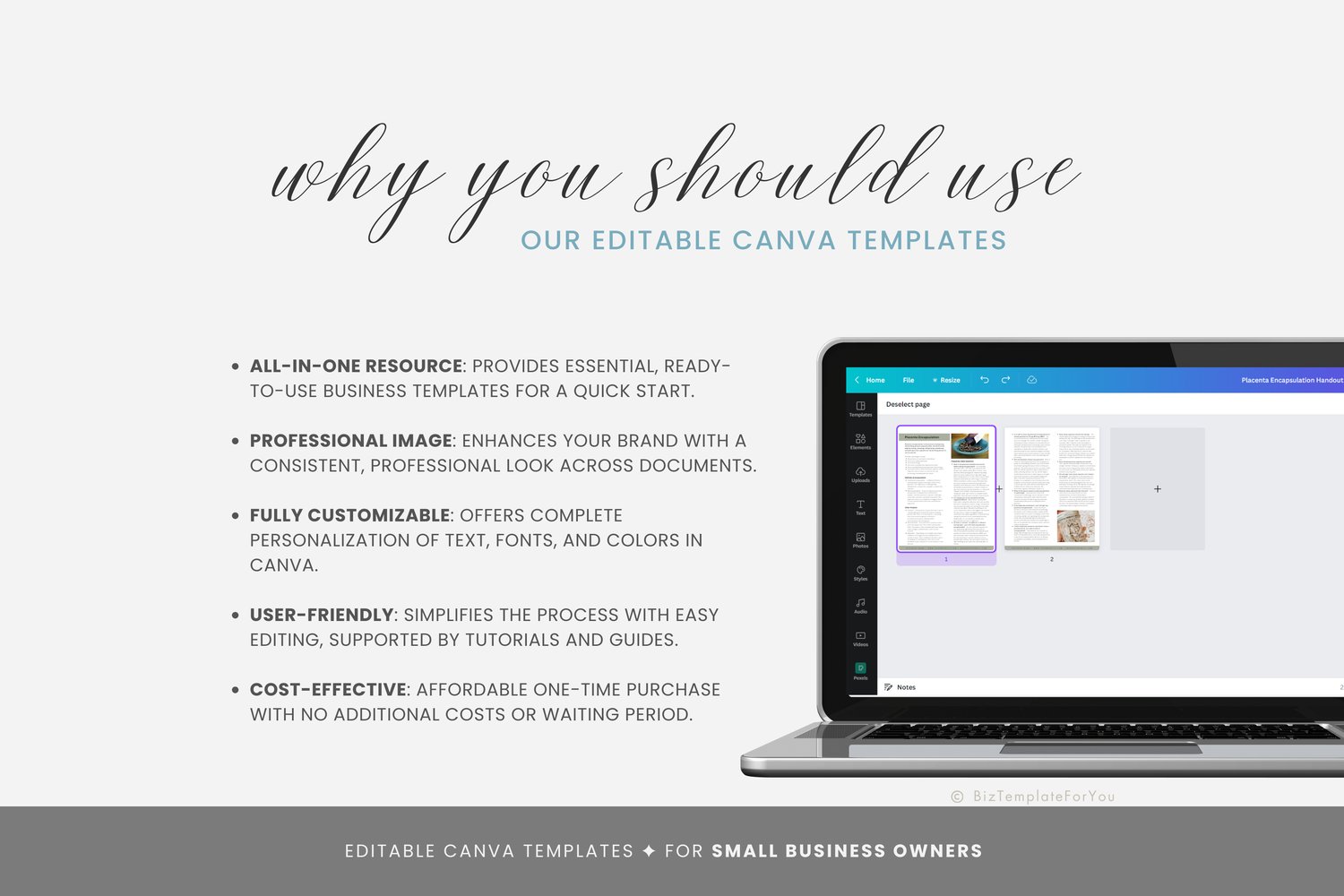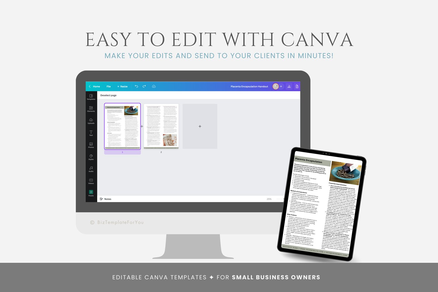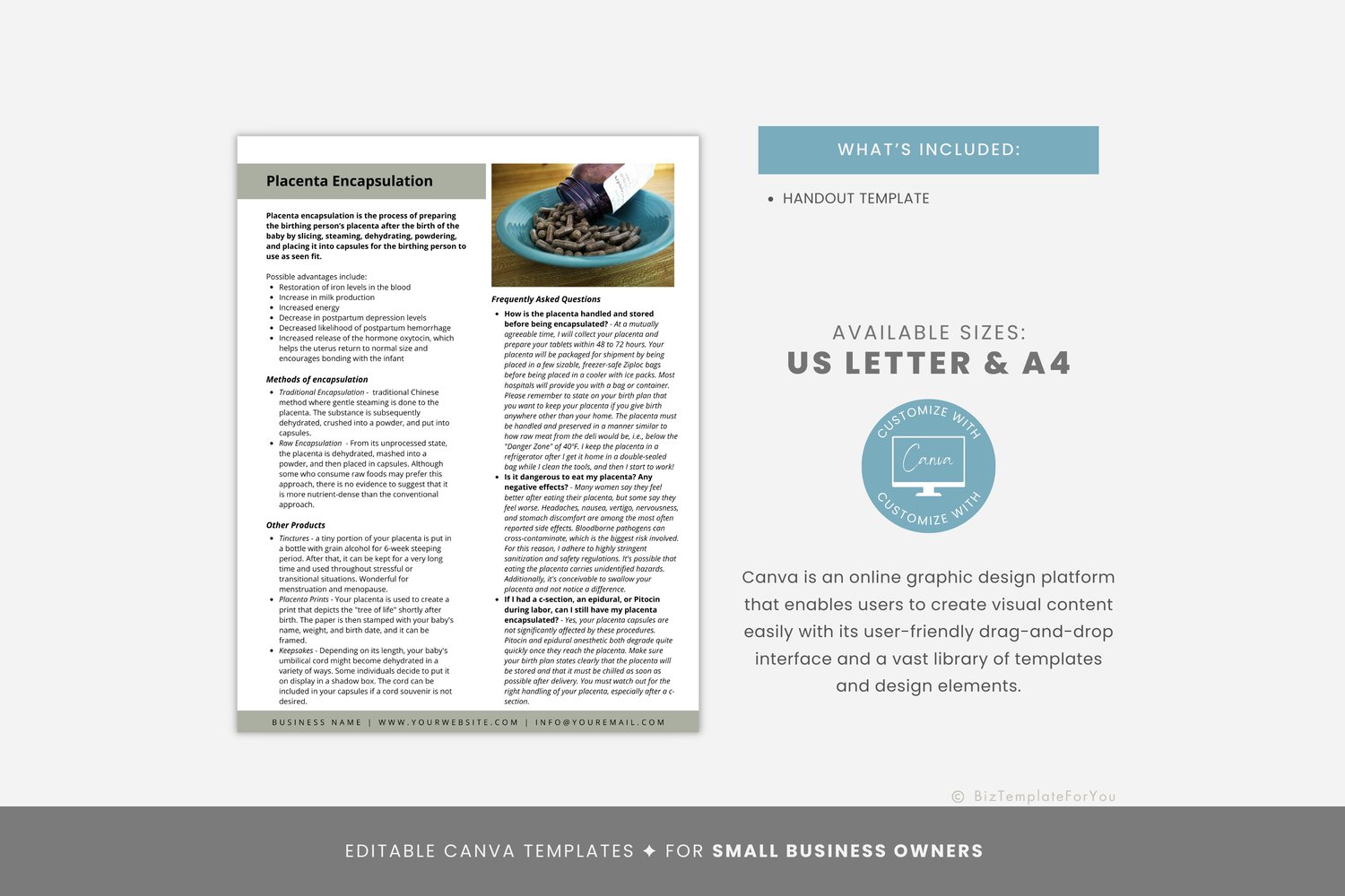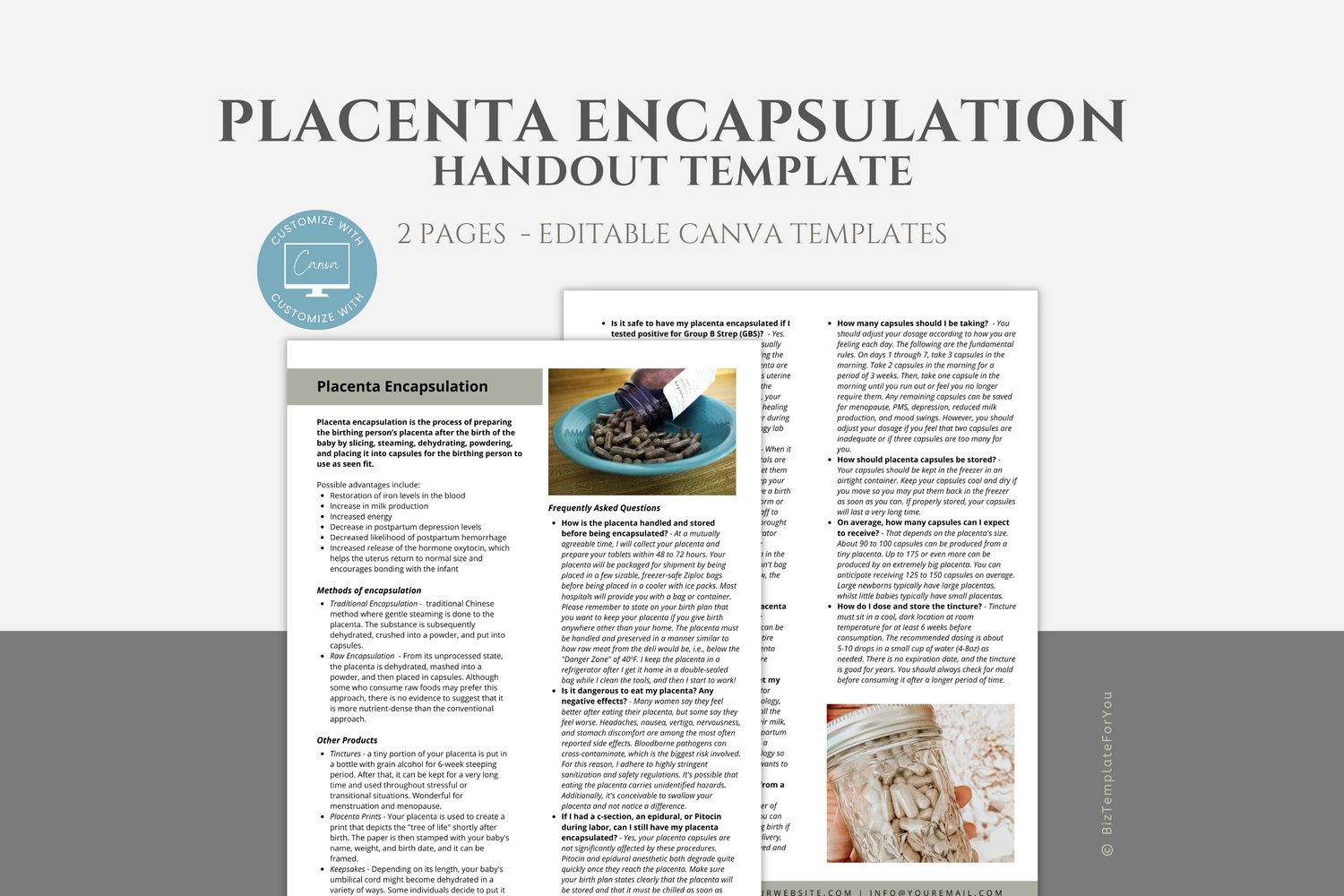 This is a 2-page Placenta Encapsulation Handout Template editable in Canva (FREE Account)! The text is already written for you, but it can also be easily edited in CANVA to add anything particular to your business or area. It is also completely customizable. Text, font, and colors are all fully editable to give you complete control of your branding and create a cohesive look for your business.