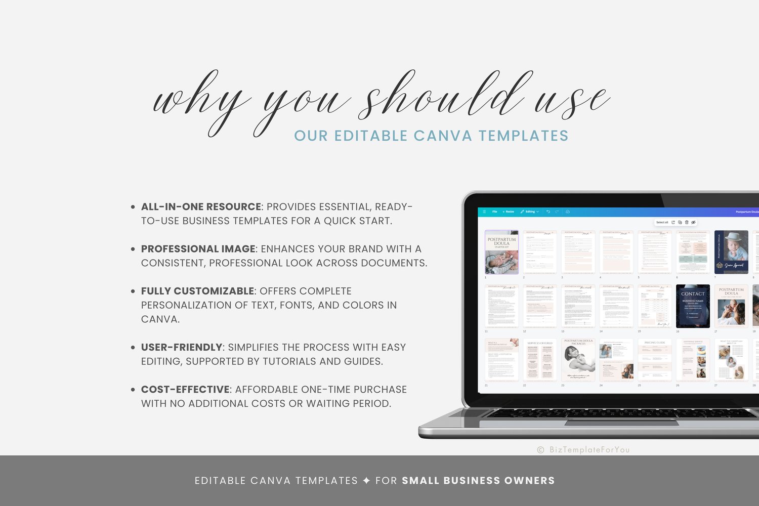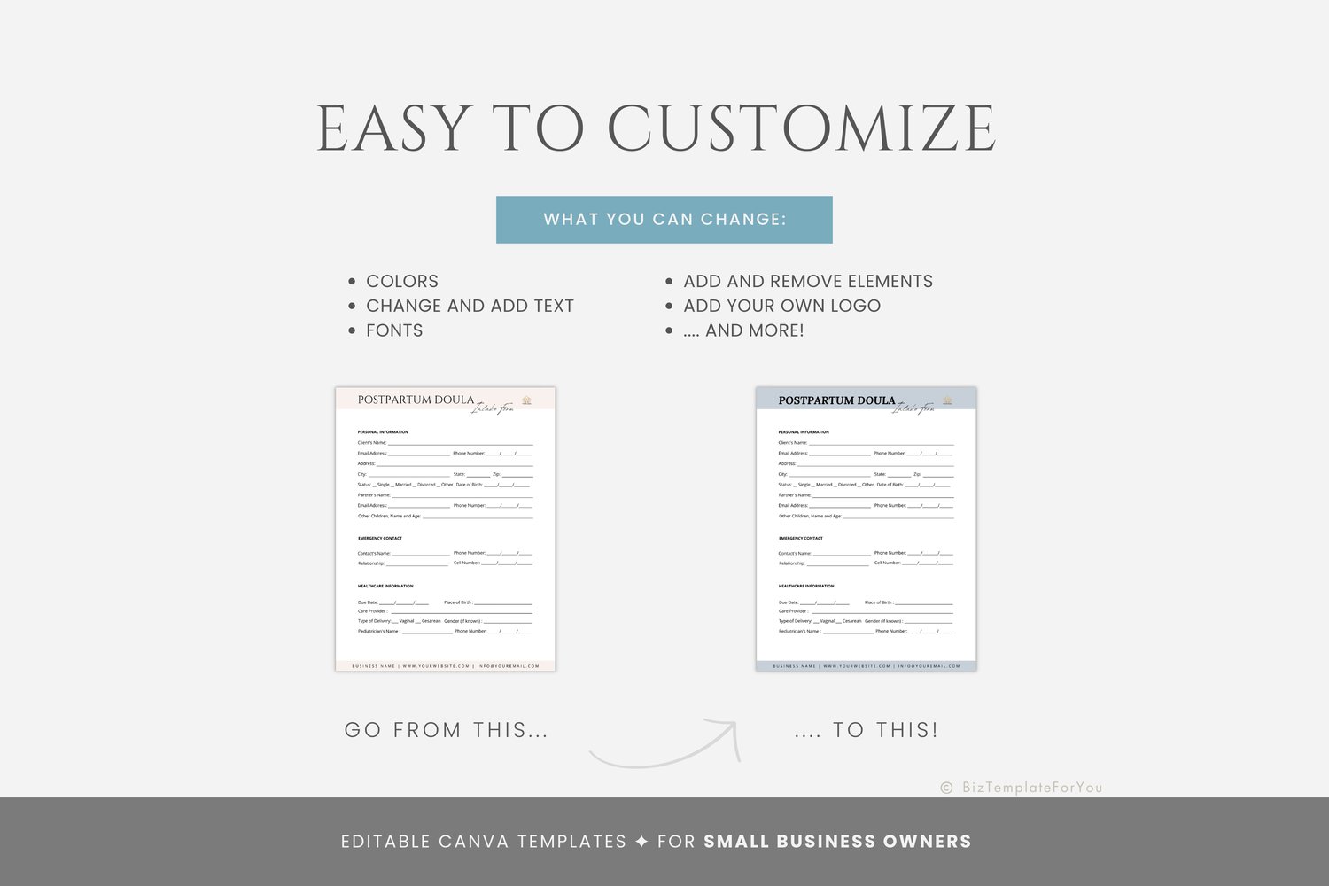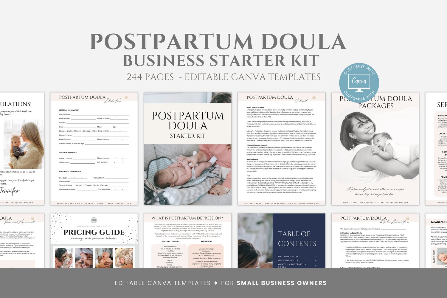 This is a 244-page Postpartum Doula Business Starter Kit editable in Canva (FREE Account)! The text is already written for you, but it can also be easily edited in CANVA to add anything particular to your business or area. It is also completely customizable. Text, font, and colors are all fully editable to give you complete control of your branding and create a cohesive look for your business.
