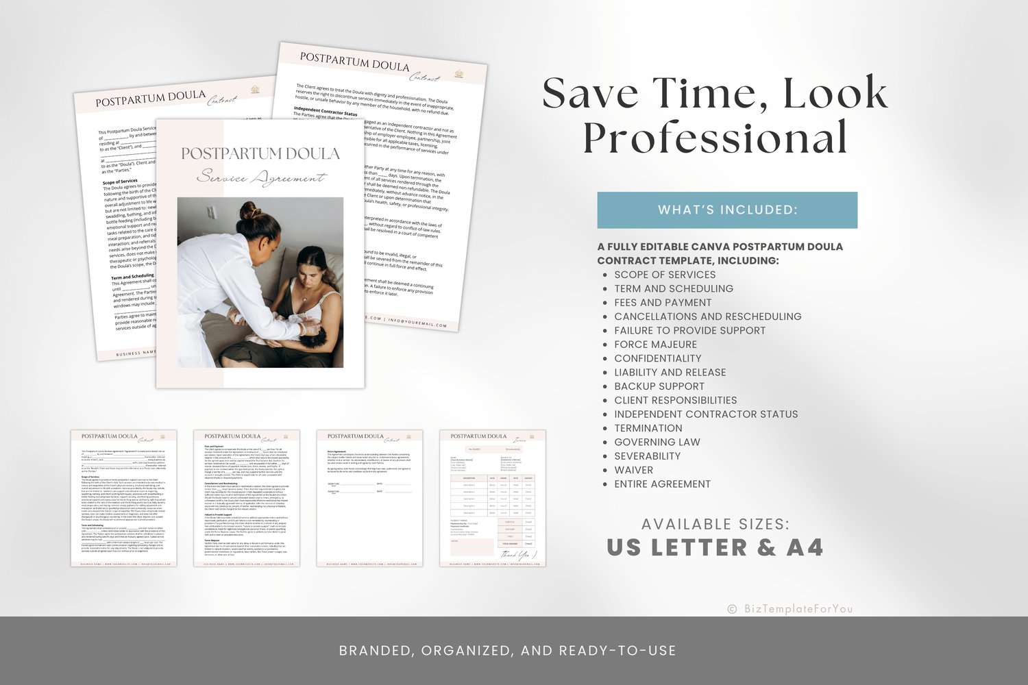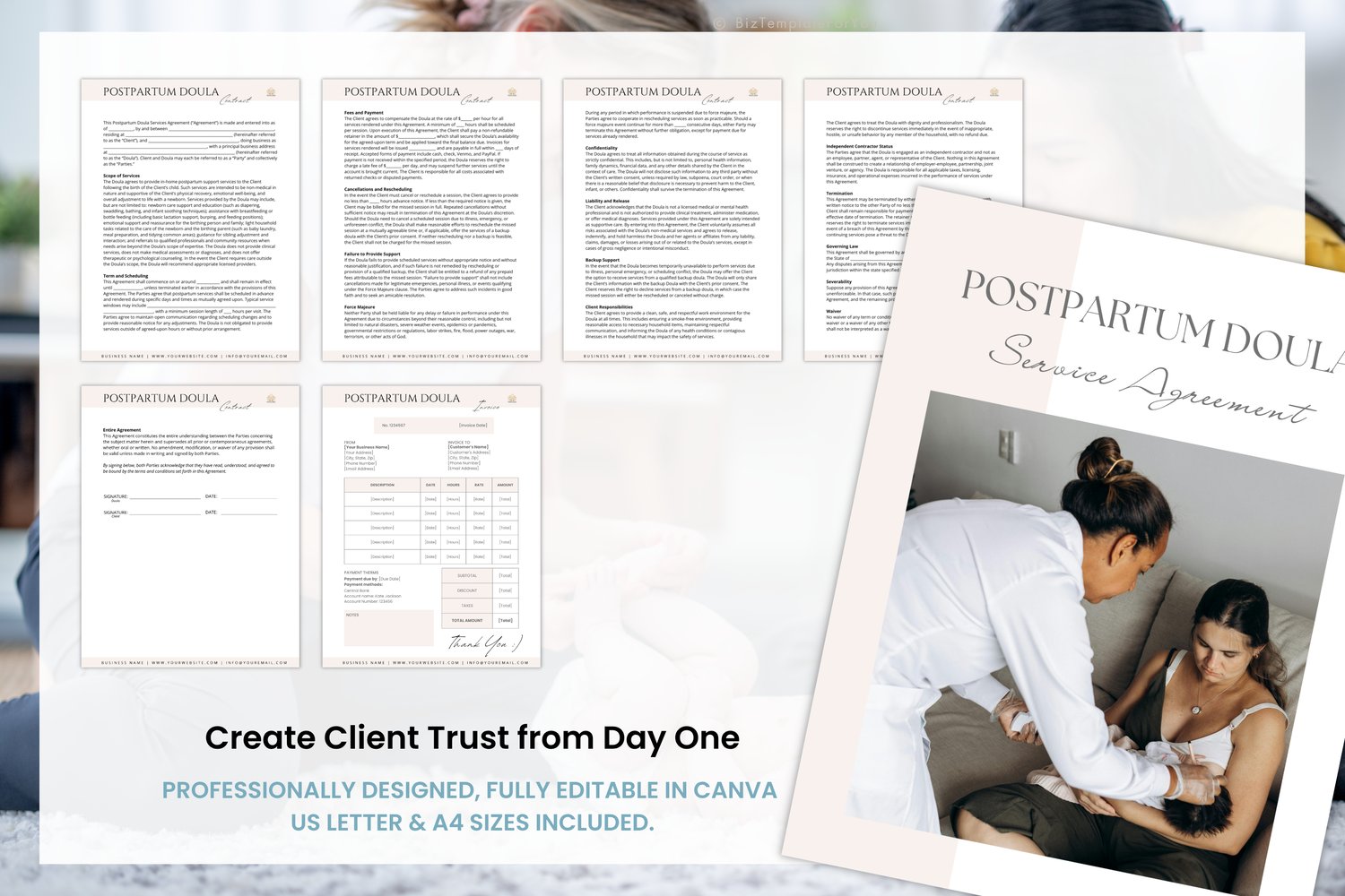 • 6 Pages Editable Postpartum Doula Contract Template (US Letter & A4 – Canva format)