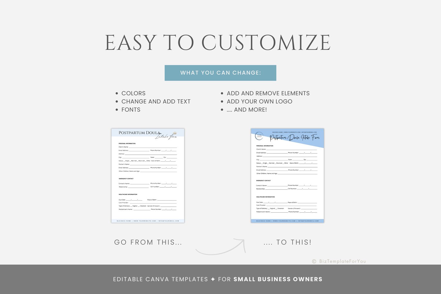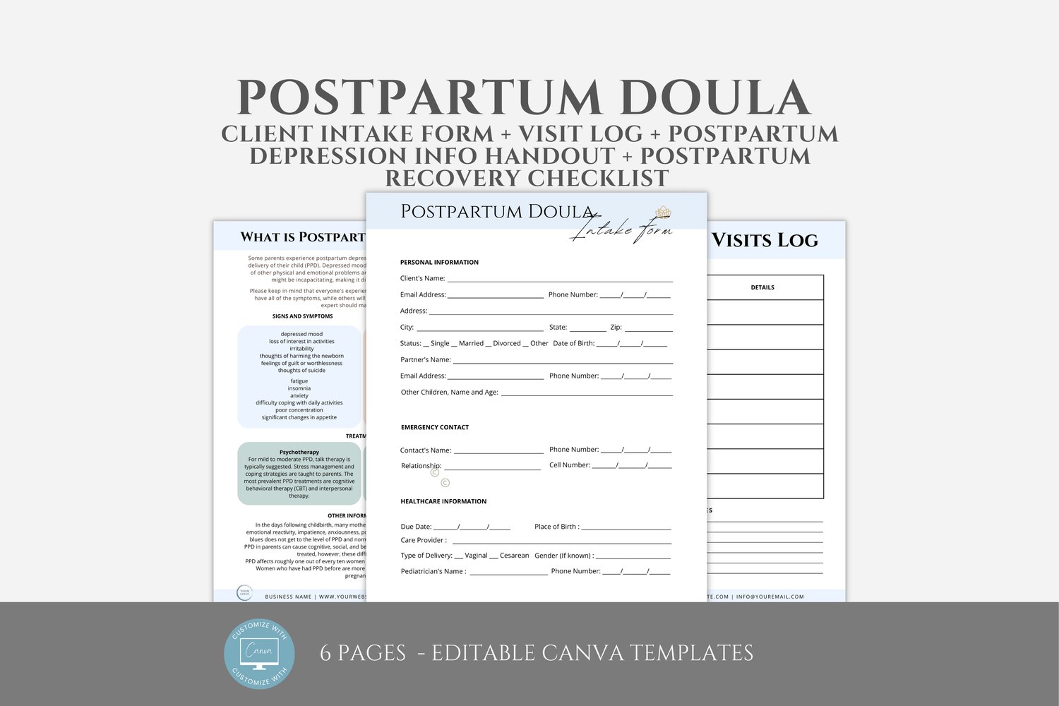 This is a 6-page Postpartum Doula Intake Form Template editable in Canva (FREE Account)! The text is already written for you, but it can also be easily edited in CANVA to add anything particular to your business or area. It is also completely customizable. Text, font, and colors are all fully editable to give you complete control of your branding and create a cohesive look for your business.