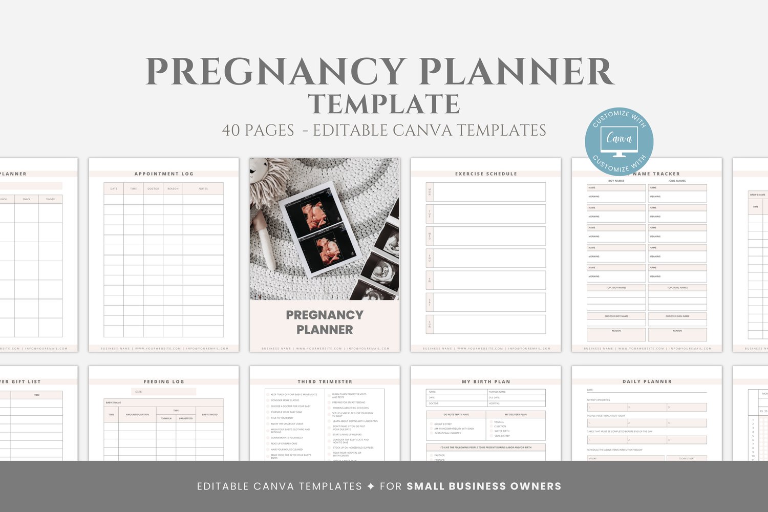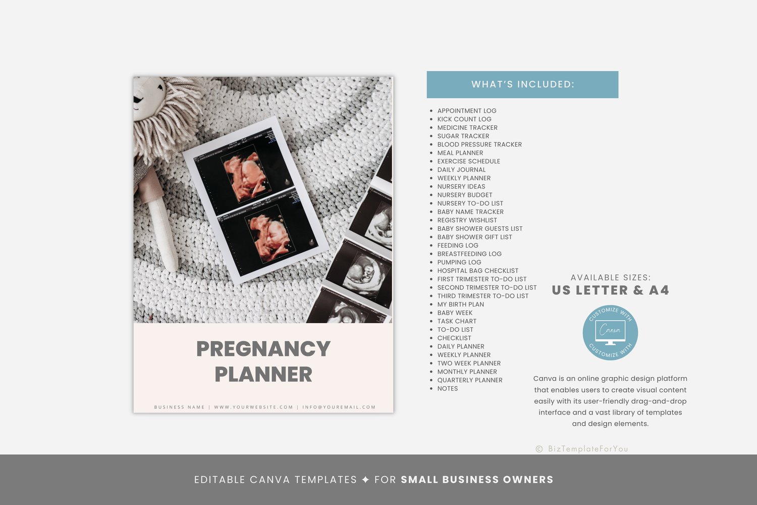 This is a 40-page Pregnancy Planner Template editable in Canva (FREE Account)! The text is already written for you, but it can also be easily edited in CANVA to add anything particular to your business or area. It is also completely customizable. Text, font, and colors are all fully editable to give you complete control of your branding and create a cohesive look for your business.