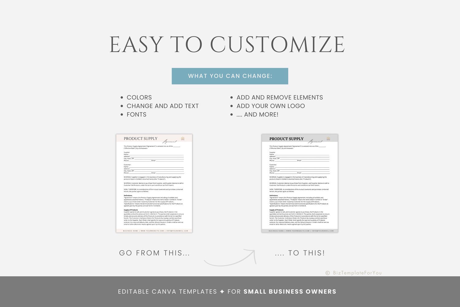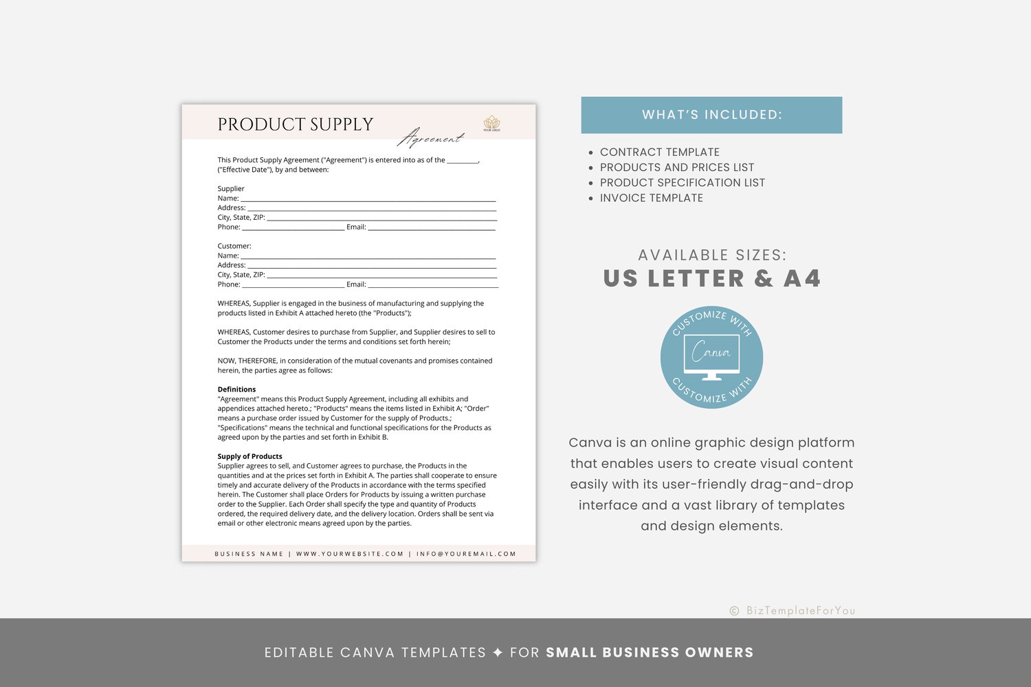 This is a 10-page Product Supply Agreement Template editable in Canva (FREE Account)! The text is already written for you, but it can also be easily edited in CANVA to add anything particular to your business or area. It is also completely customizable. Text, font, and colors are all fully editable to give you complete control of your branding and create a cohesive look for your business.