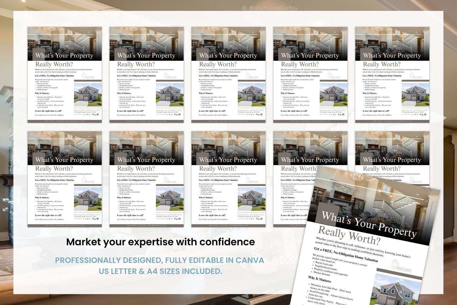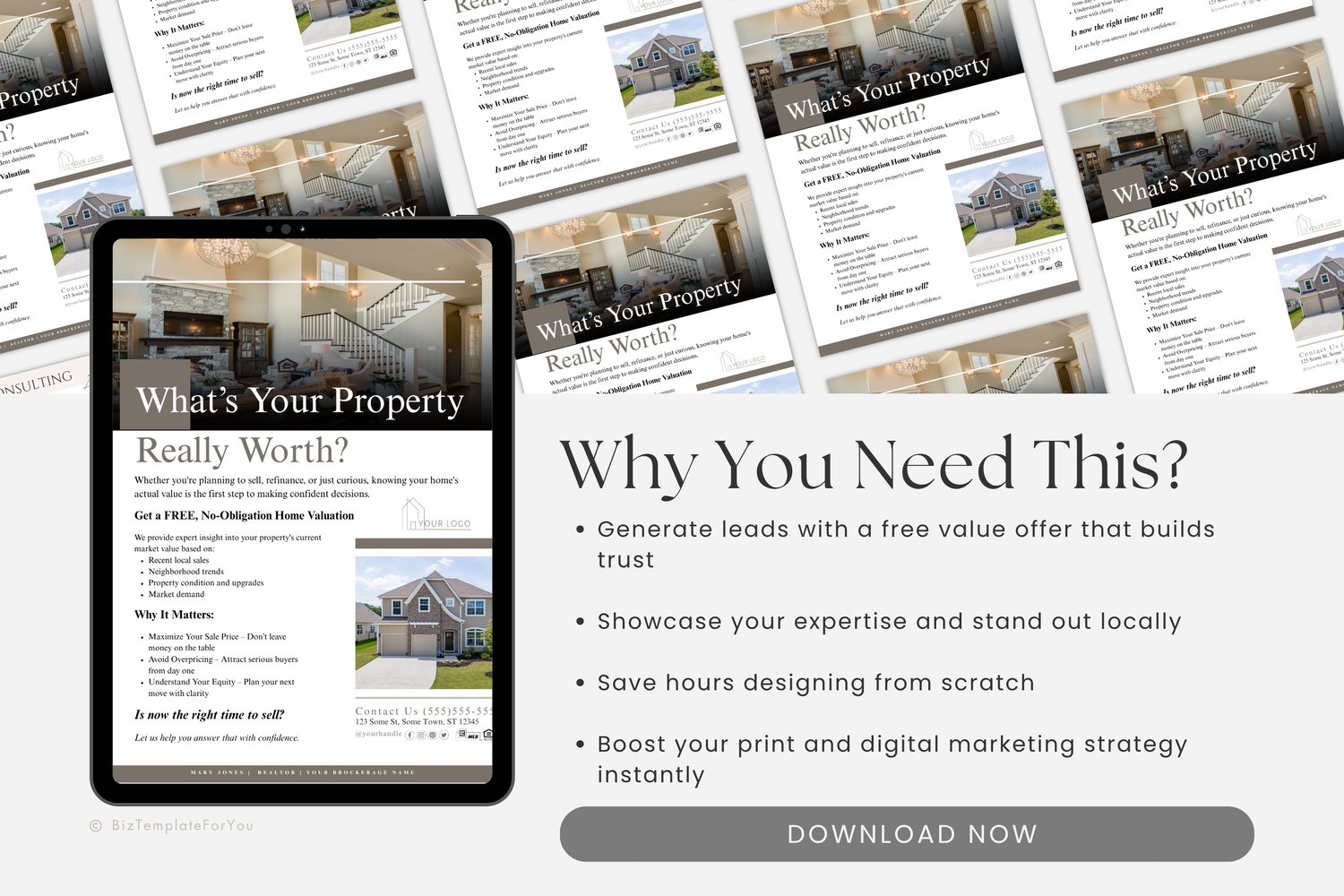 It’s already written for you, so you can simply drop in your contact info, headshot, and logo in Canva—and it’s ready to print or post digitally. This flyer offers a free home value estimate while reinforcing your market knowledge and professional edge.