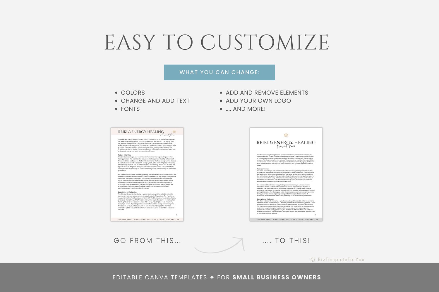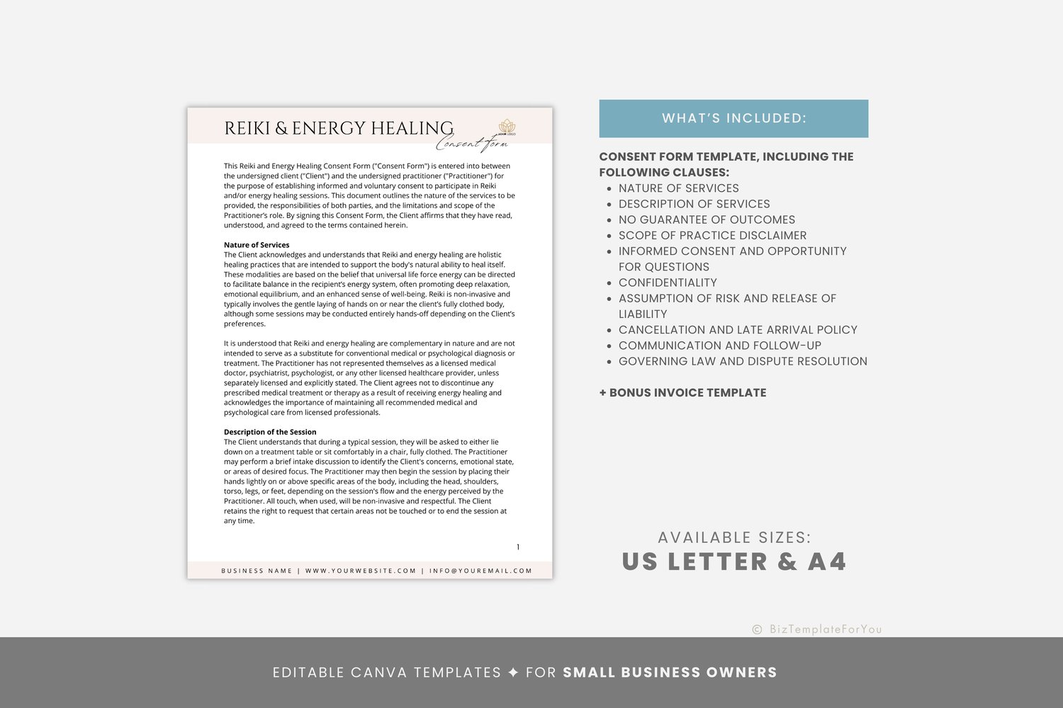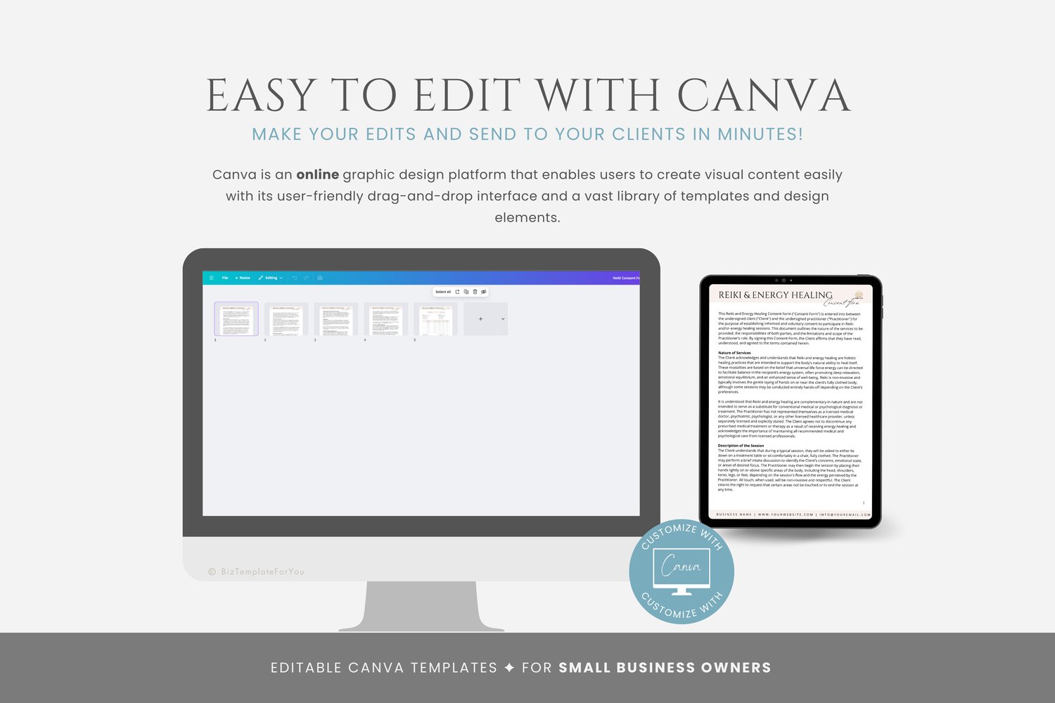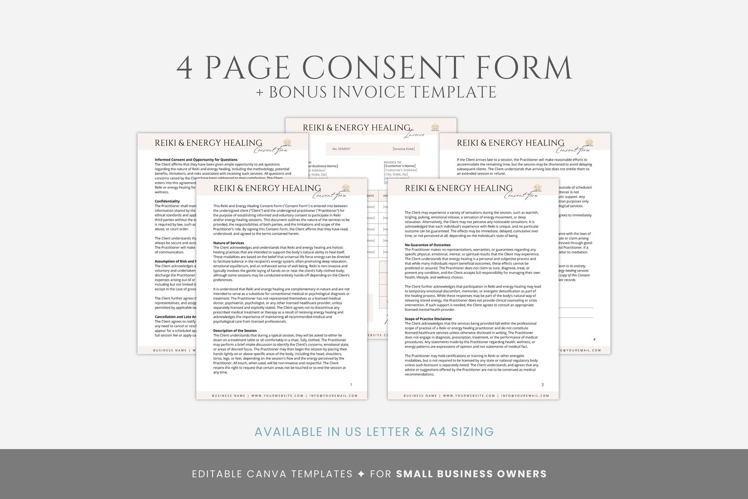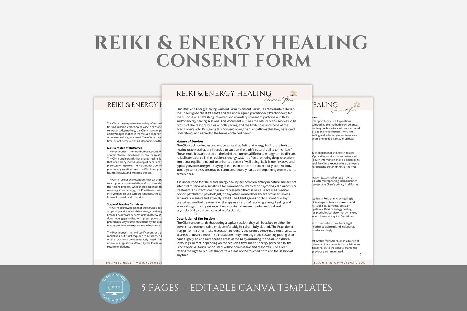 This is a 5-page Reiki Consent Form Template editable in Canva (FREE Account)! The text has already been written for you, but it can also be easily edited in CANVA to add anything particular to your business or area. It is also completely customizable. Text, font, and colors are all fully editable to give you complete control of your branding and create a cohesive look for your business.