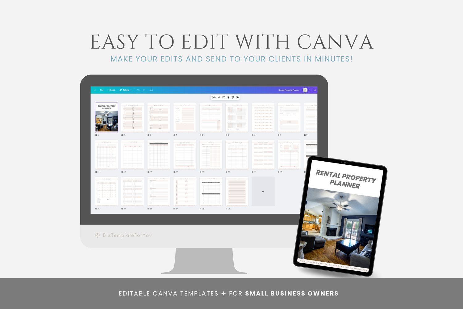 This is a 26-page Rental Property Planner Template editable in Canva (FREE Account)! The text is already written for you, but it can also be easily edited in CANVA to add anything particular to your business or area. It is also completely customizable. Text, font, and colors are all fully editable to give you complete control of your branding and create a cohesive look for your business.