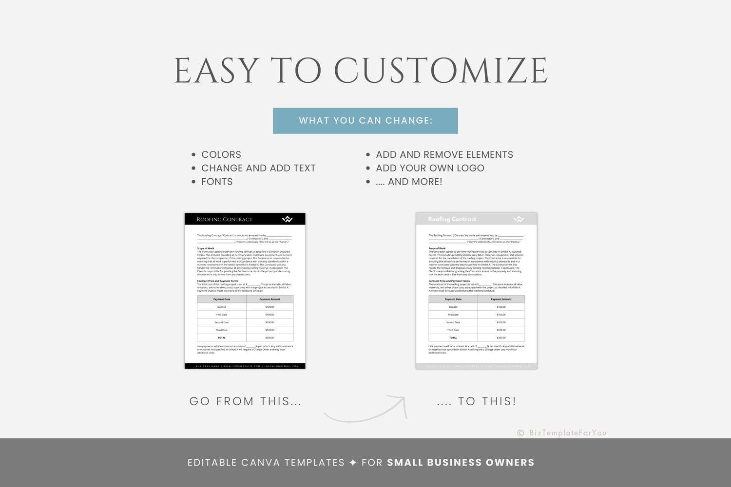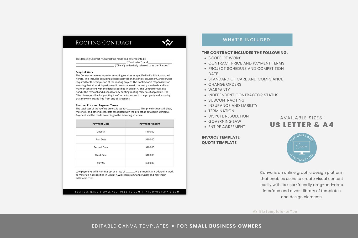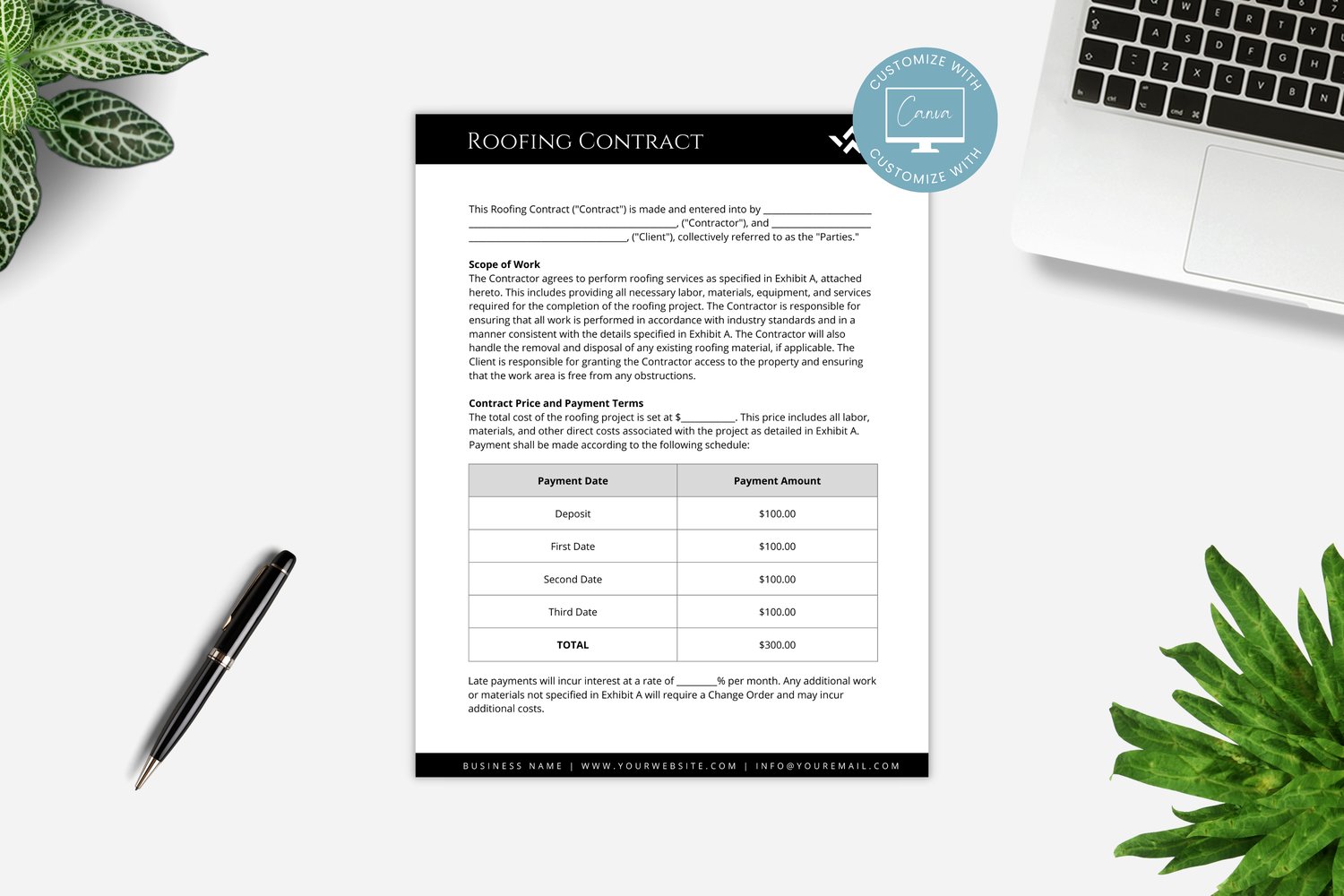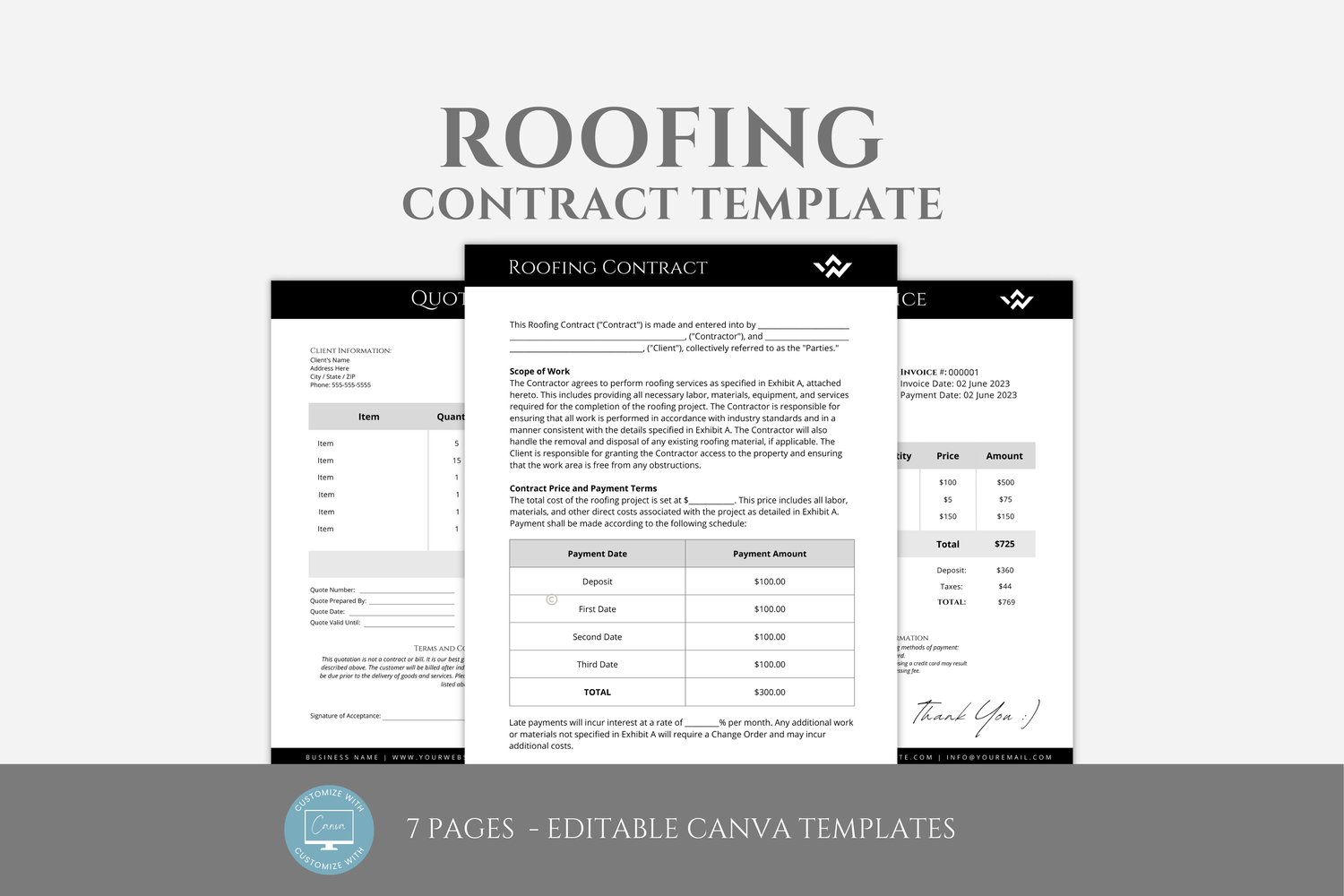 This is a 7-page Roofing Contract Template editable in Canva (FREE Account)! The text is already written for you, but it is also easily edited in CANVA to add anything that is particular to your business or area. It is also completely customizable. Text, font, and colors are all fully editable to give you complete control of your branding and create a cohesive look for your business.