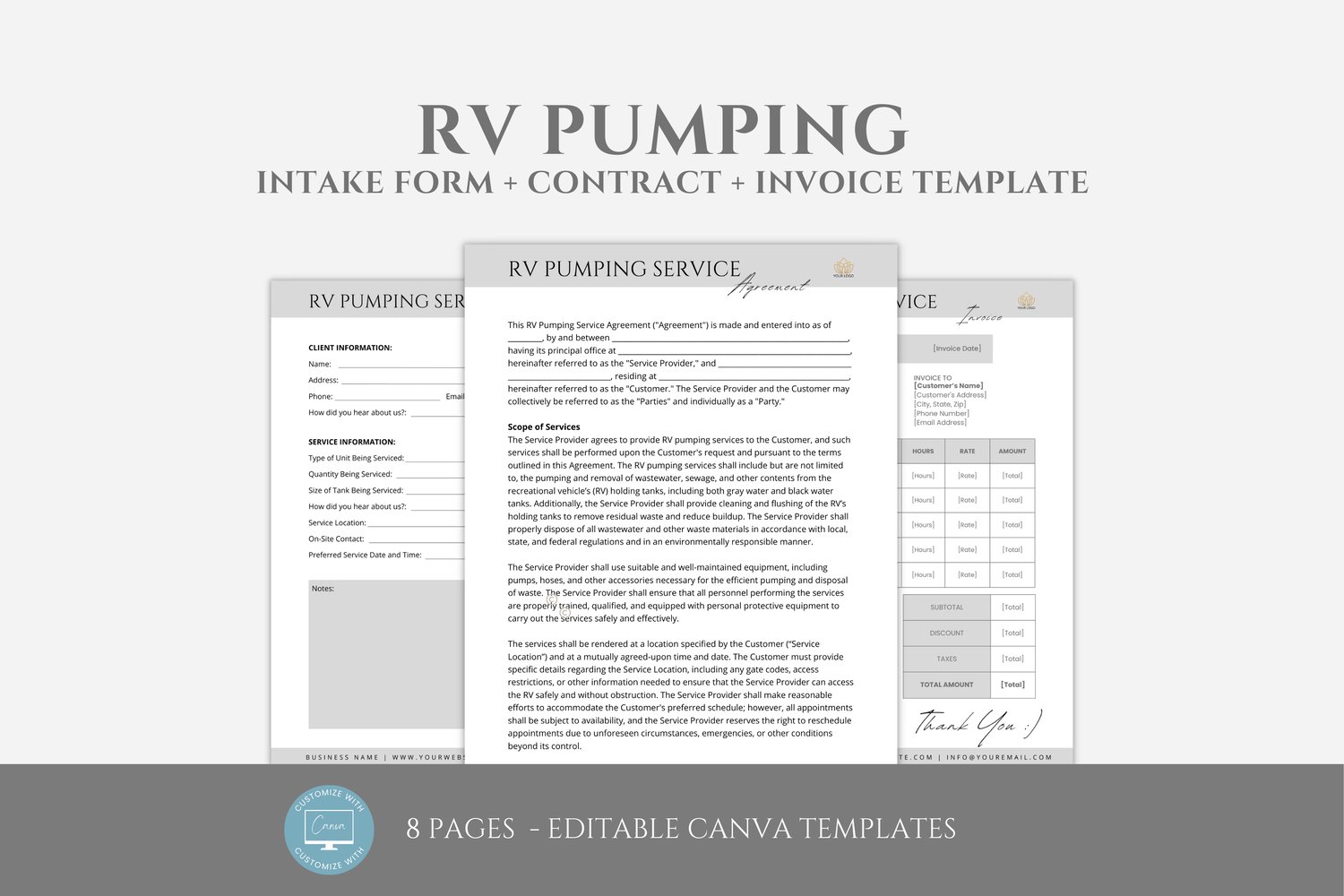 This is an 8-page RV Pumping Service Agreement Template editable in Canva (FREE Account)! The text is already written for you, but it can also be easily edited in CANVA to add anything particular to your business or area. It is also completely customizable. Text, font, and colors are all fully editable to give you complete control of your branding and create a cohesive look for your business.