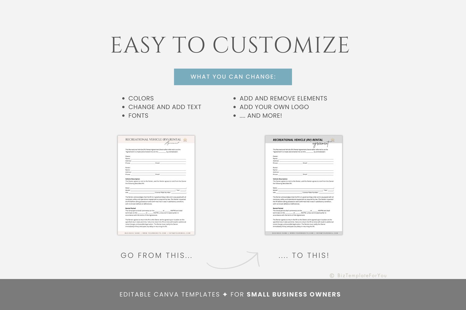 This is a 7-page RV Rental Agreement Template editable in Canva (FREE Account)! The text is already written for you, but it is also easily edited in CANVA to add anything particular to your business or area. It is also completely customizable. Text, font, and colors are all fully editable to give you complete control of your branding and create a cohesive look for your business.