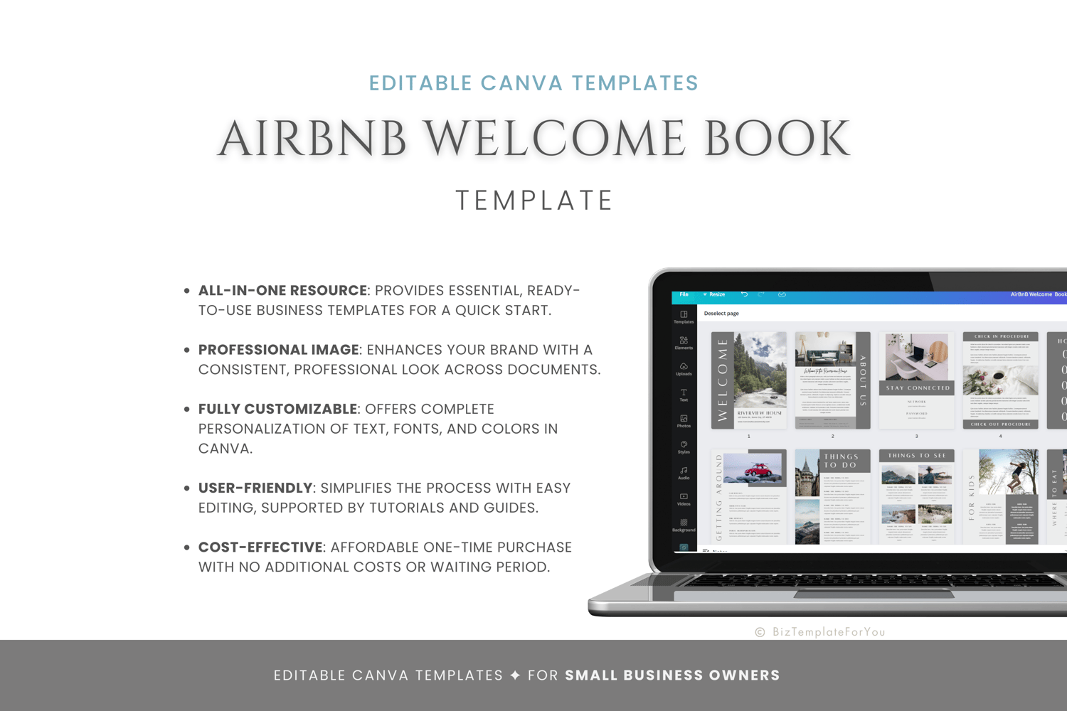 This is a 17-page Airbnb Welcome Book template editable in Canva (FREE Account)! The text is already written for you, but it is also easily edited in CANVA to add anything that is particular to your business or area. It is also completely customizable. Text, font, and colors are all fully editable to give you complete control of your branding and create a cohesive look for your business.