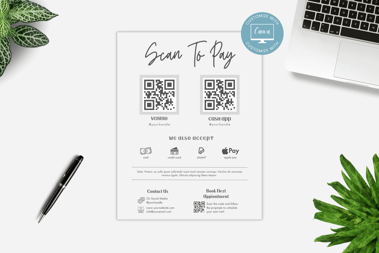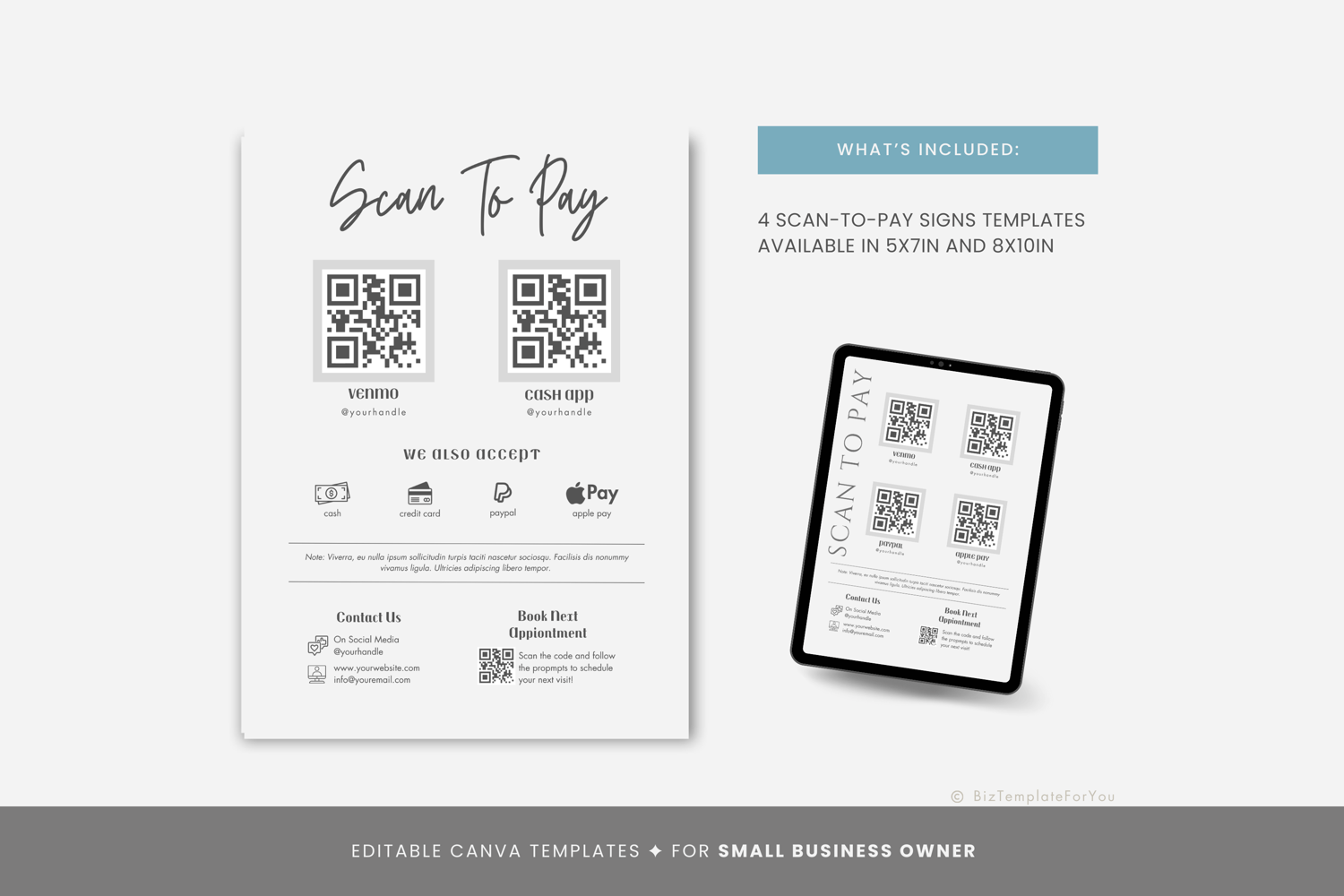 This is a 4-page Scan to Pay Template editable in Canva (FREE Account)! The text is already written for you, but it is also easily edited in CANVA to add anything that is particular to your business or area. It is also completely customizable. Text, font, and colors are all fully editable to give you complete control of your branding and create a cohesive look for your business.