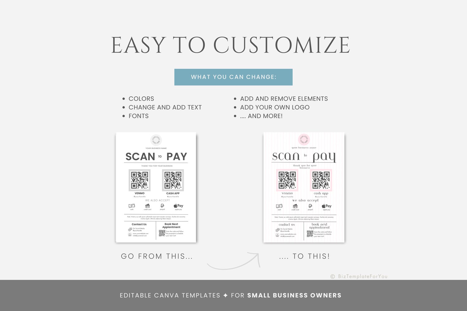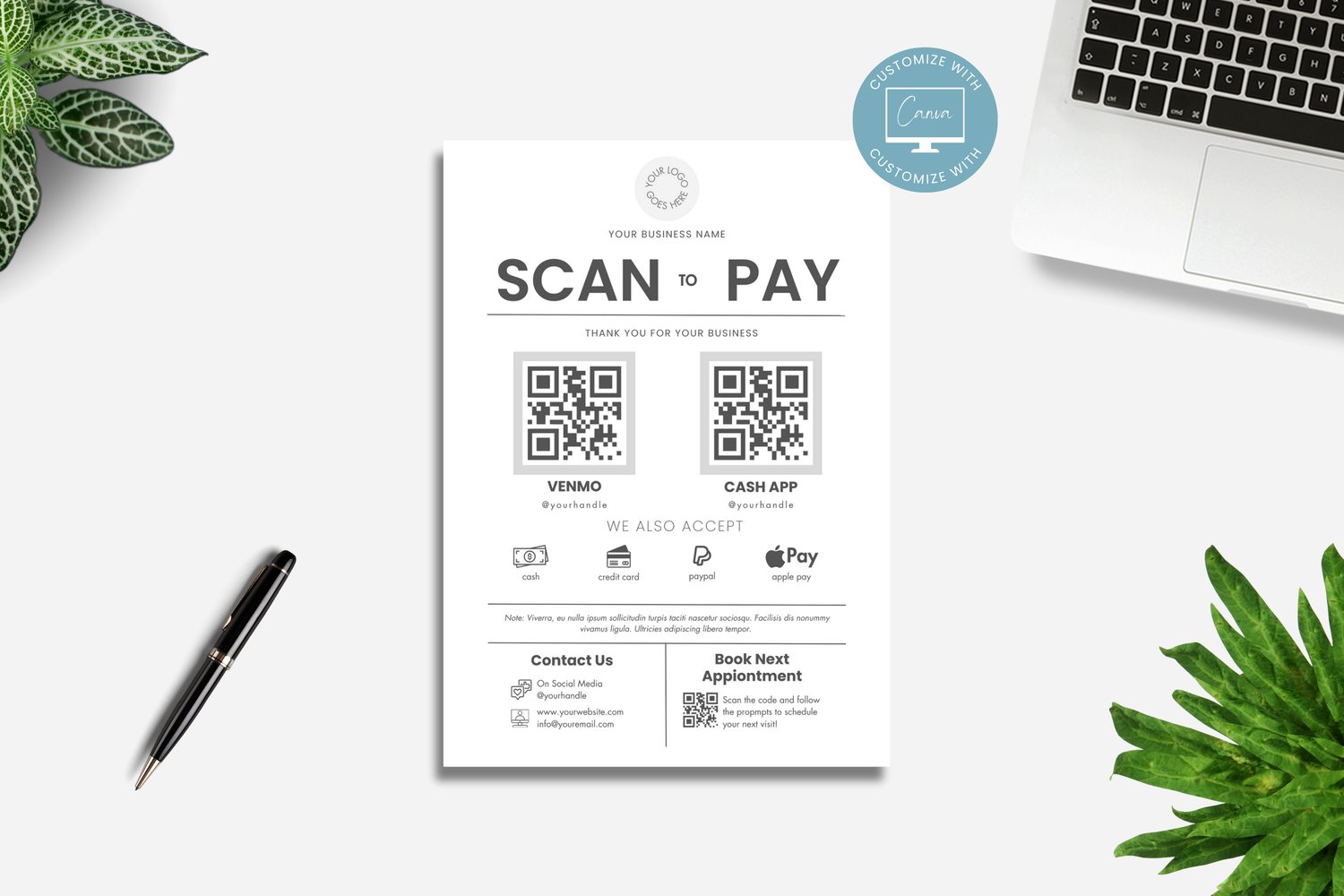 This is a 1-page Scan to Pay Template editable in Canva (FREE Account)! The text is already written for you, but it is also easily edited in CANVA to add anything that is particular to your business or area. It is also completely customizable. Text, font, and colors are all fully editable to give you complete control of your branding and create a cohesive look for your business.