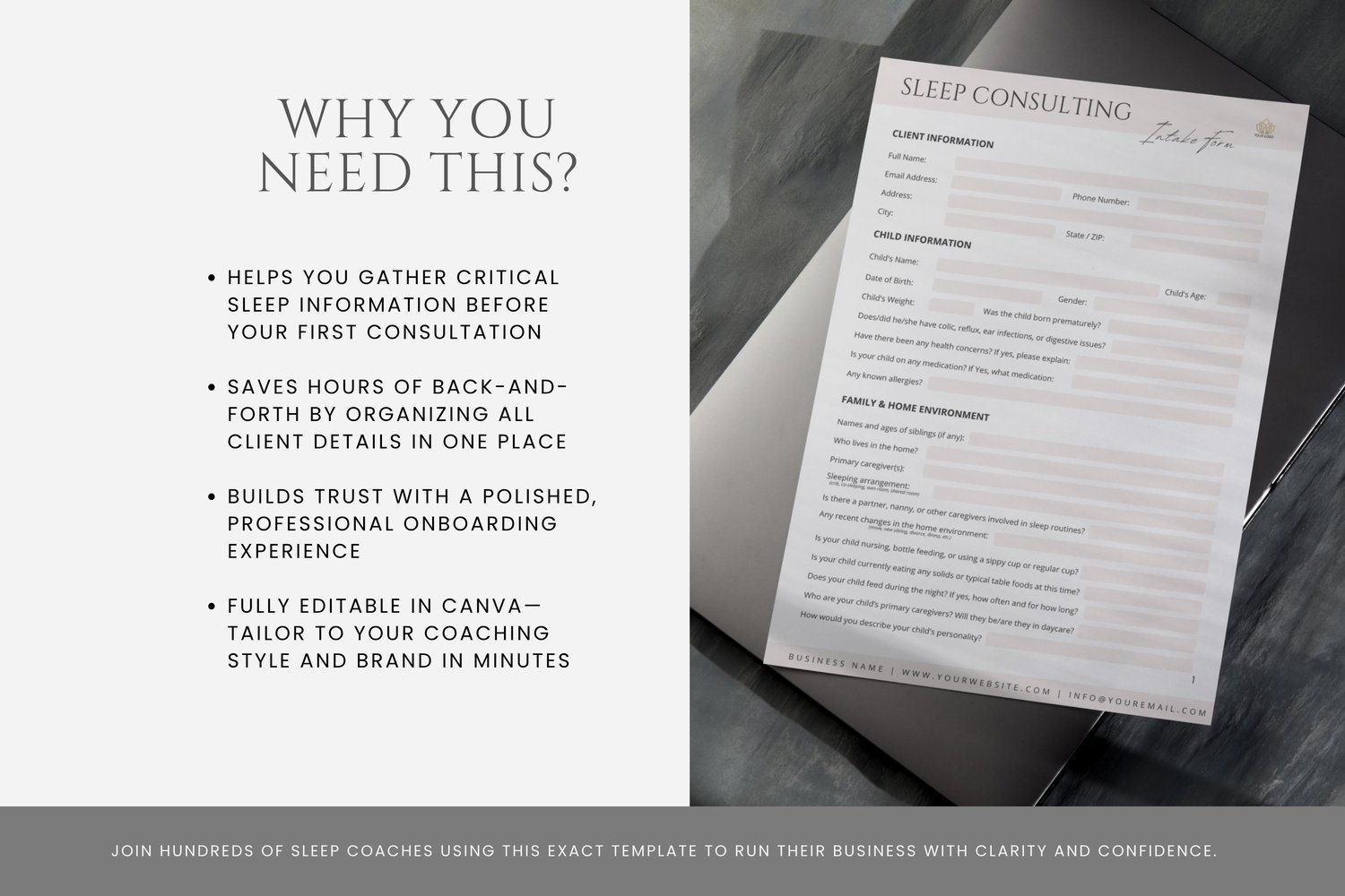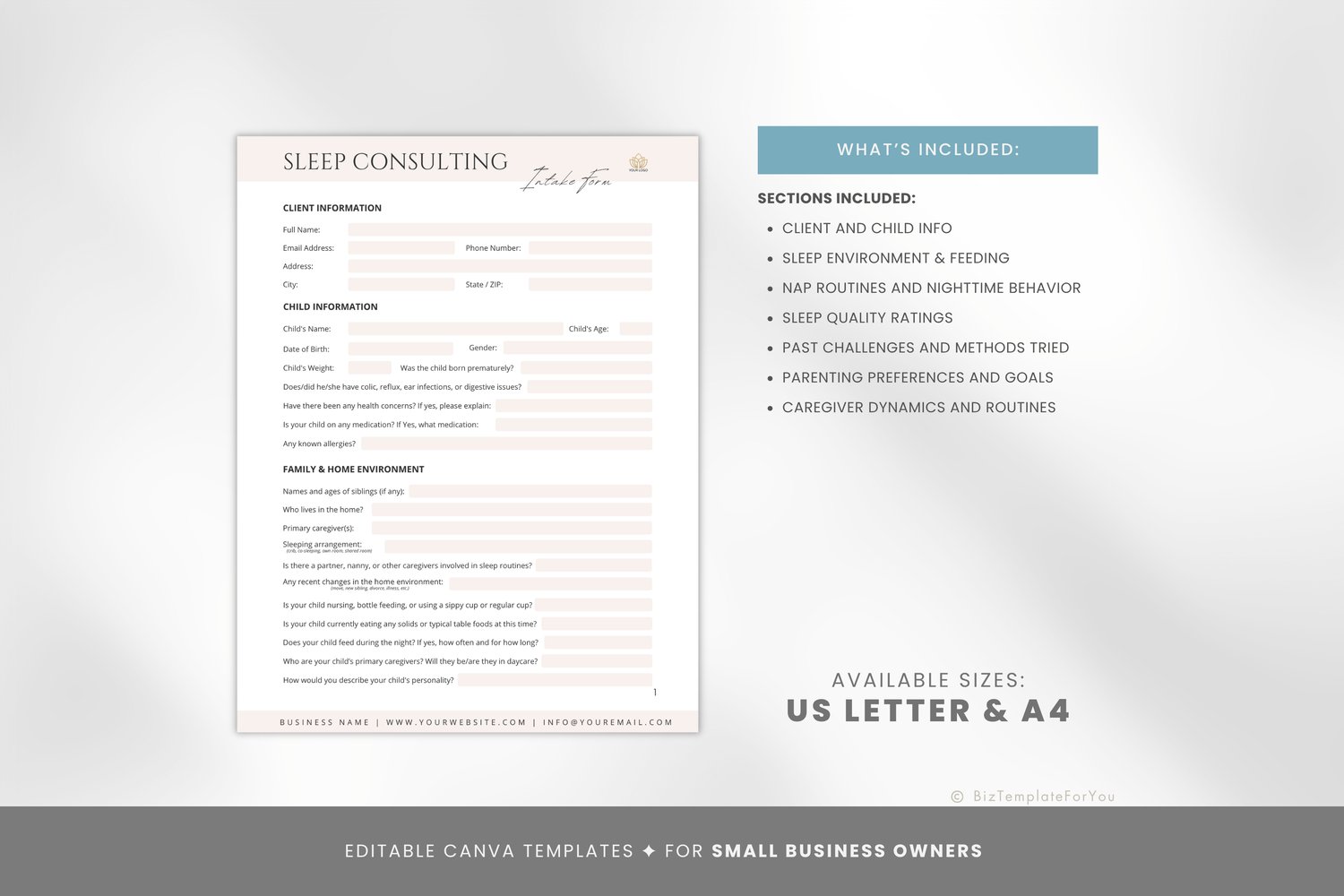 Editable Pediatric Sleep Consultant Client Intake Form Template, Baby Sleep Coaching Client Questionnaire, Sleep Coach Onboarding, Canva #1054
