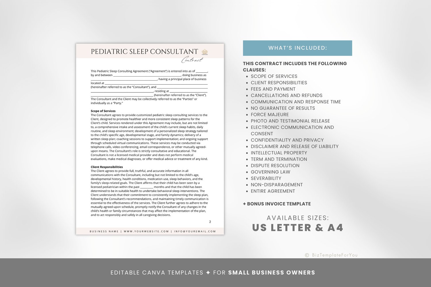 Editable Pediatric Sleep Consultant Contract Template, Baby Sleep Coaching Agreement, Newborn Sleep Consulting Paperwork, Canva Template #1029