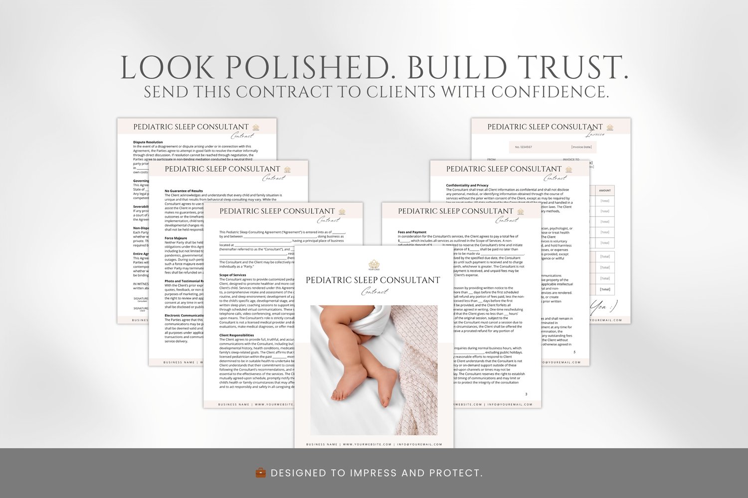 Protect your services and present your business professionally with this Editable Pediatric Sleep Consultant Contract Template, designed specifically for sleep coaches, baby sleep consultants, infant sleep educators, and parent coaching professionals.