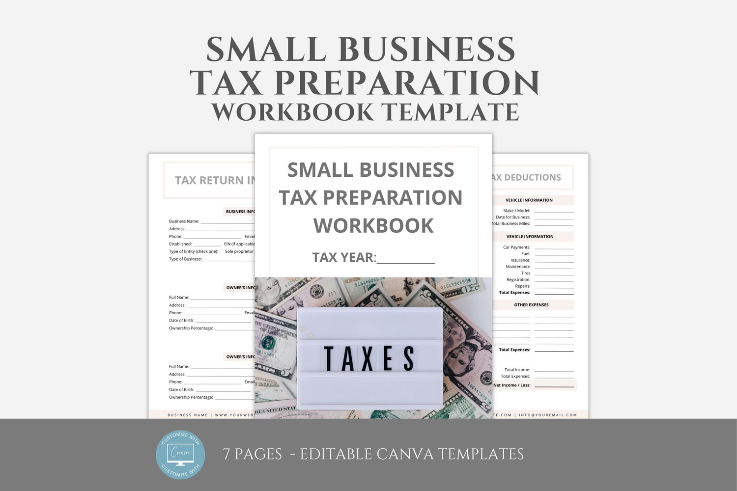 This is a 7-page Editable Small Business Tax Preparation Workbook Template editable in Canva (FREE Account)! The text is already written for you, but it is also easily edited in CANVA to add anything that is particular to your business or area. It is also completely customizable. Text, font, and colors are all fully editable to give you complete control of your branding and create a cohesive look for your business.