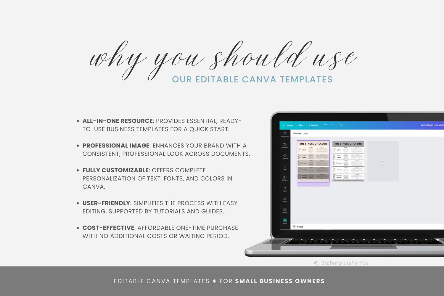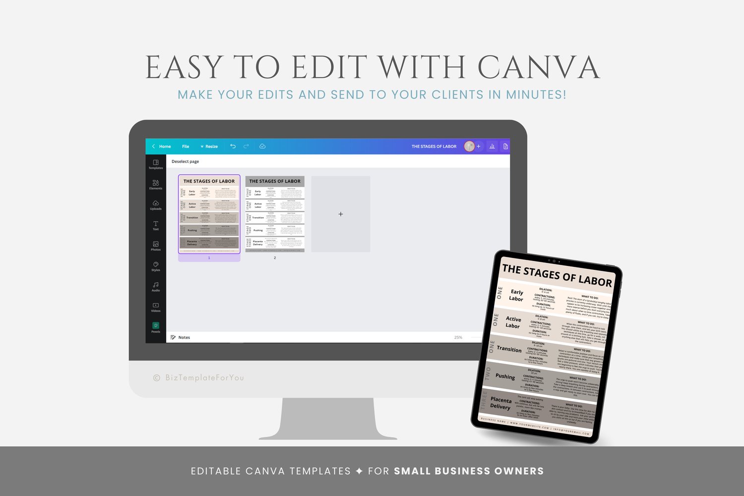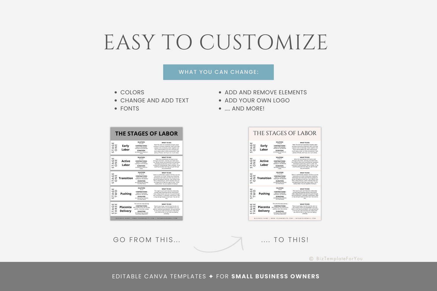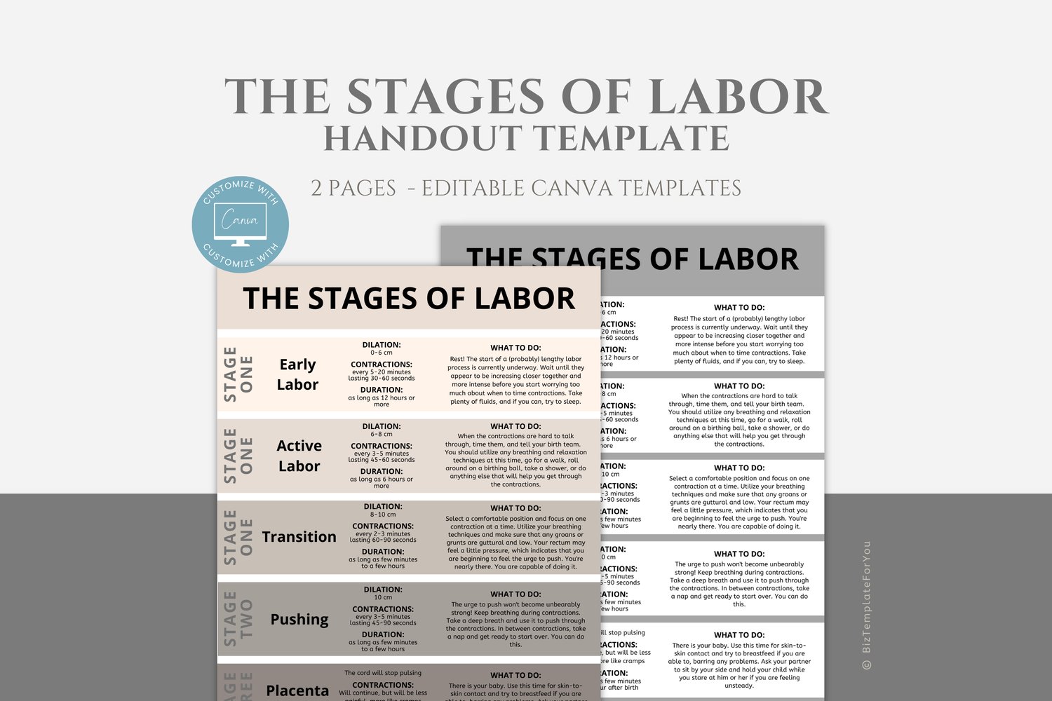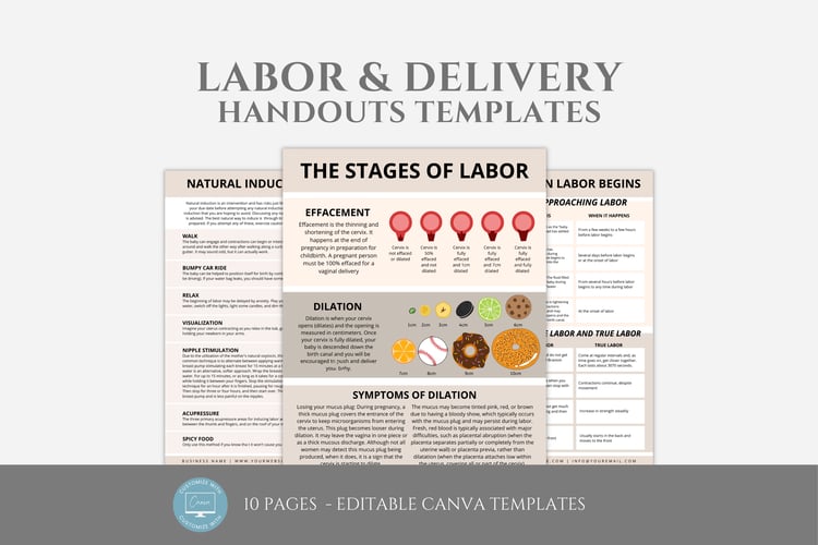 This is a 2-page Stages of Labor Handout Templates editable in Canva (FREE Account)! The text is already written for you, but it is also easily edited in CANVA to add anything that is particular to your business or area. It is also completely customizable. Text, font, and colors are all fully editable to give you complete control of your branding and create a cohesive look for your business.