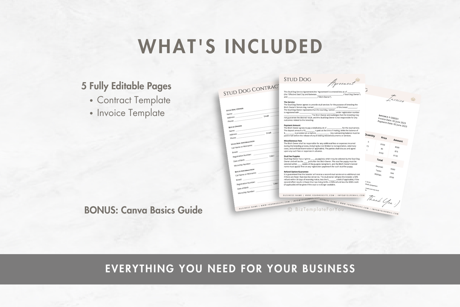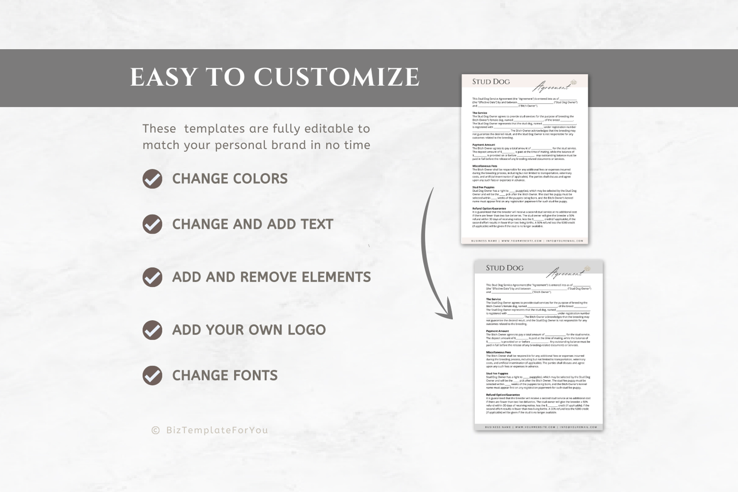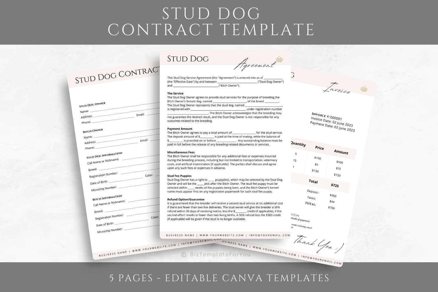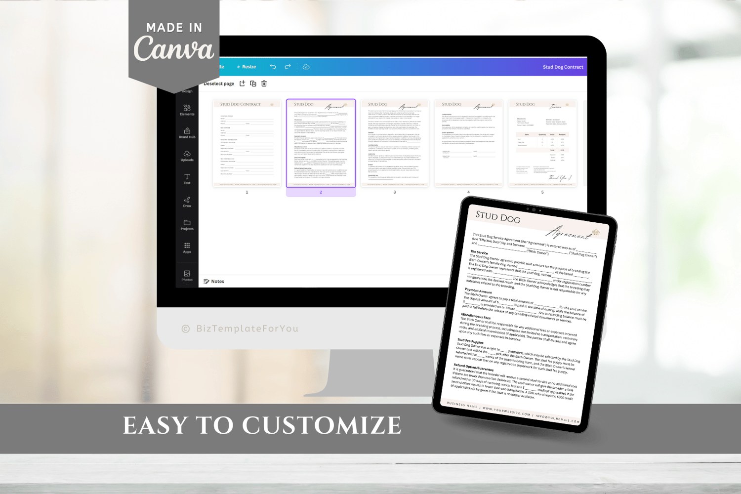 This is a 5-page Stud Dog Contract Template editable in Canva (FREE Account)! The text is already written for you but it is also easily edited in CANVA to add anything that is particular to your business or area it is also completely customizable. Text, font, and colors are all fully editable to give you complete control of your branding and create a cohesive look for your business.