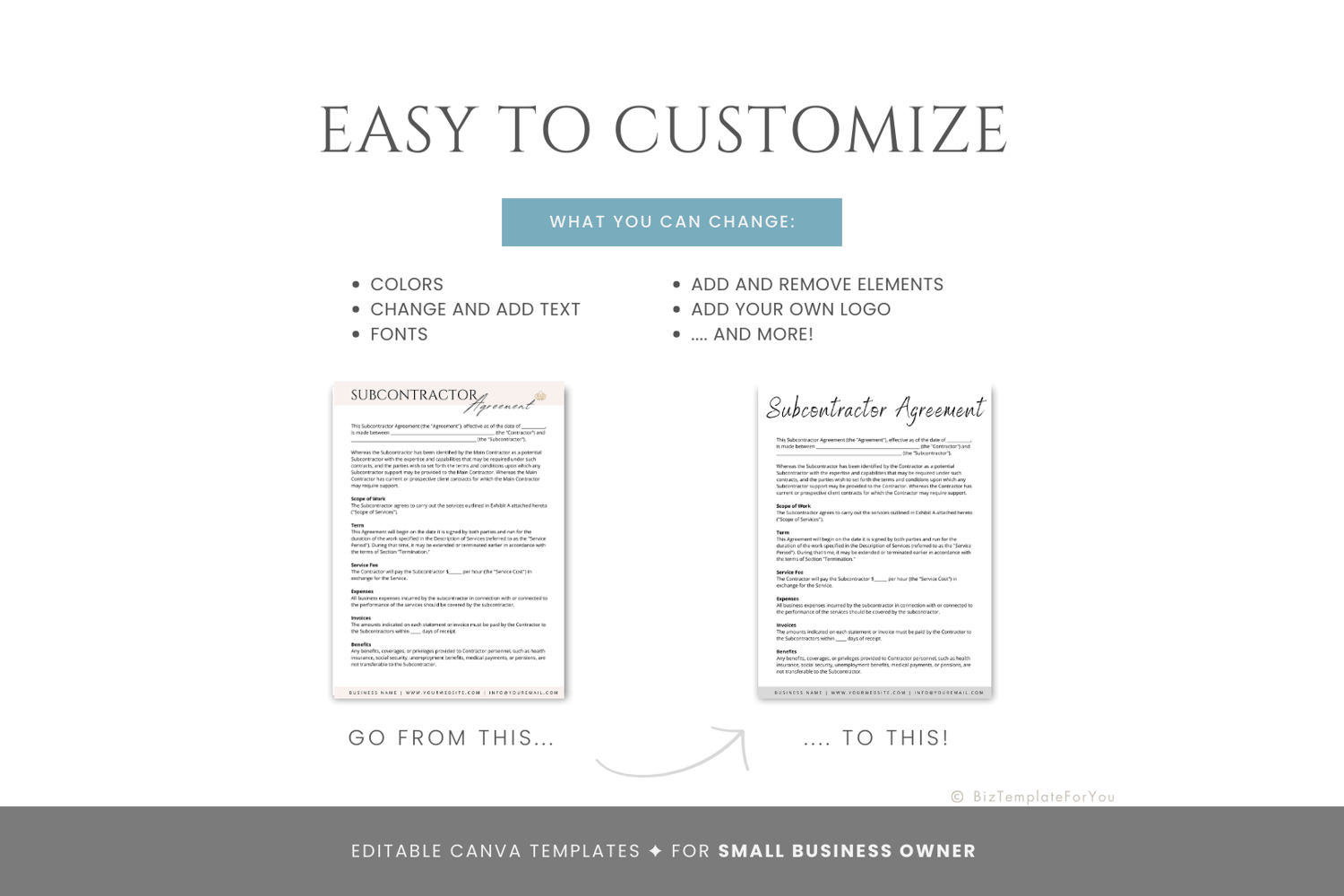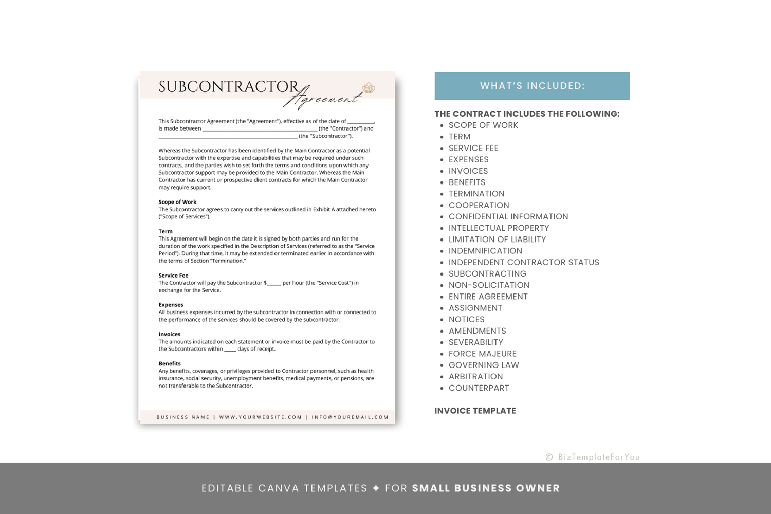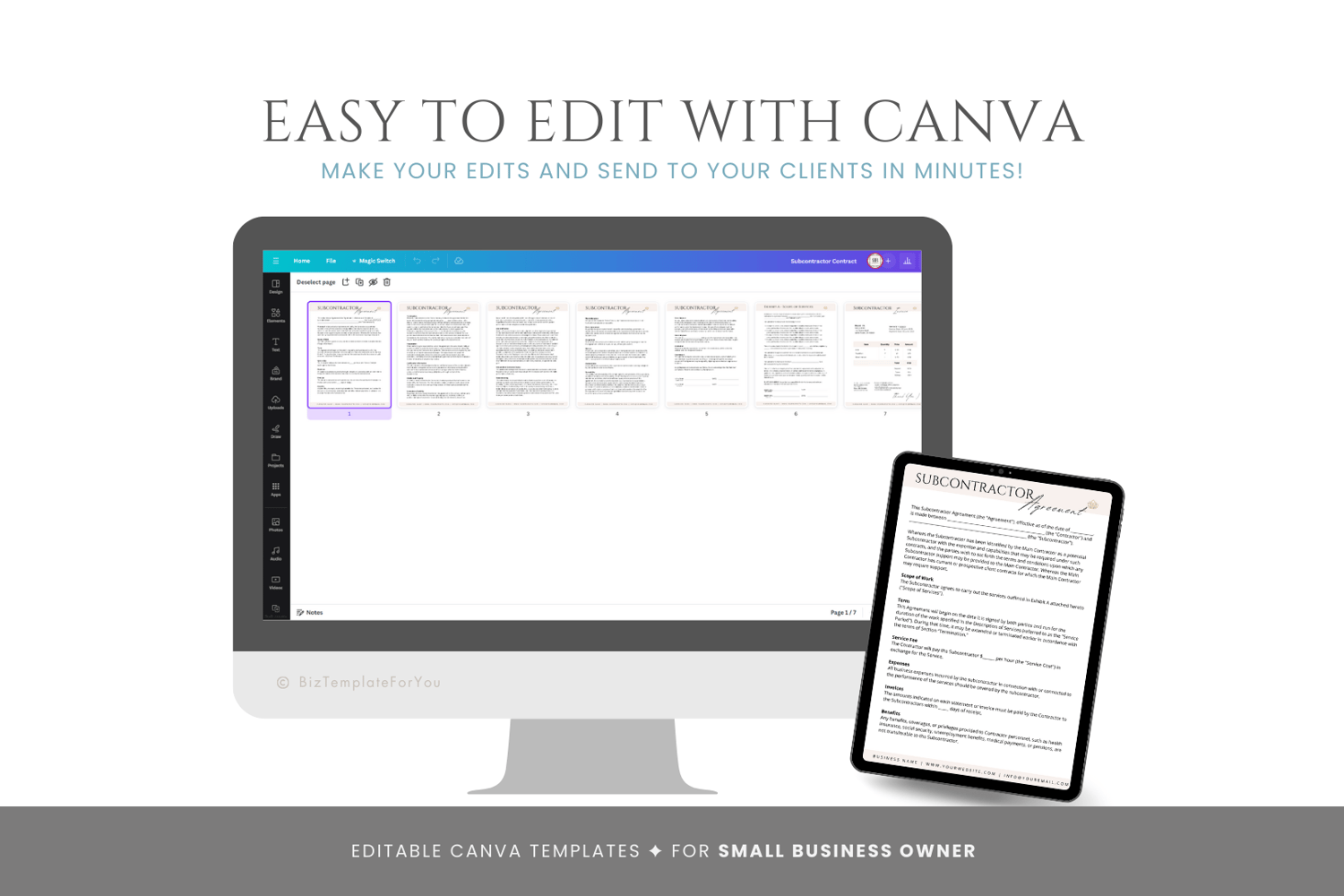 This is a 7-page Subcontractor Agreement Template editable in Canva (FREE Account)! The text is already written for you, but it is also easily edited in CANVA to add anything that is particular to your business or area. It is also completely customizable. Text, font, and colors are all fully editable to give you complete control of your branding and create a cohesive look for your business.