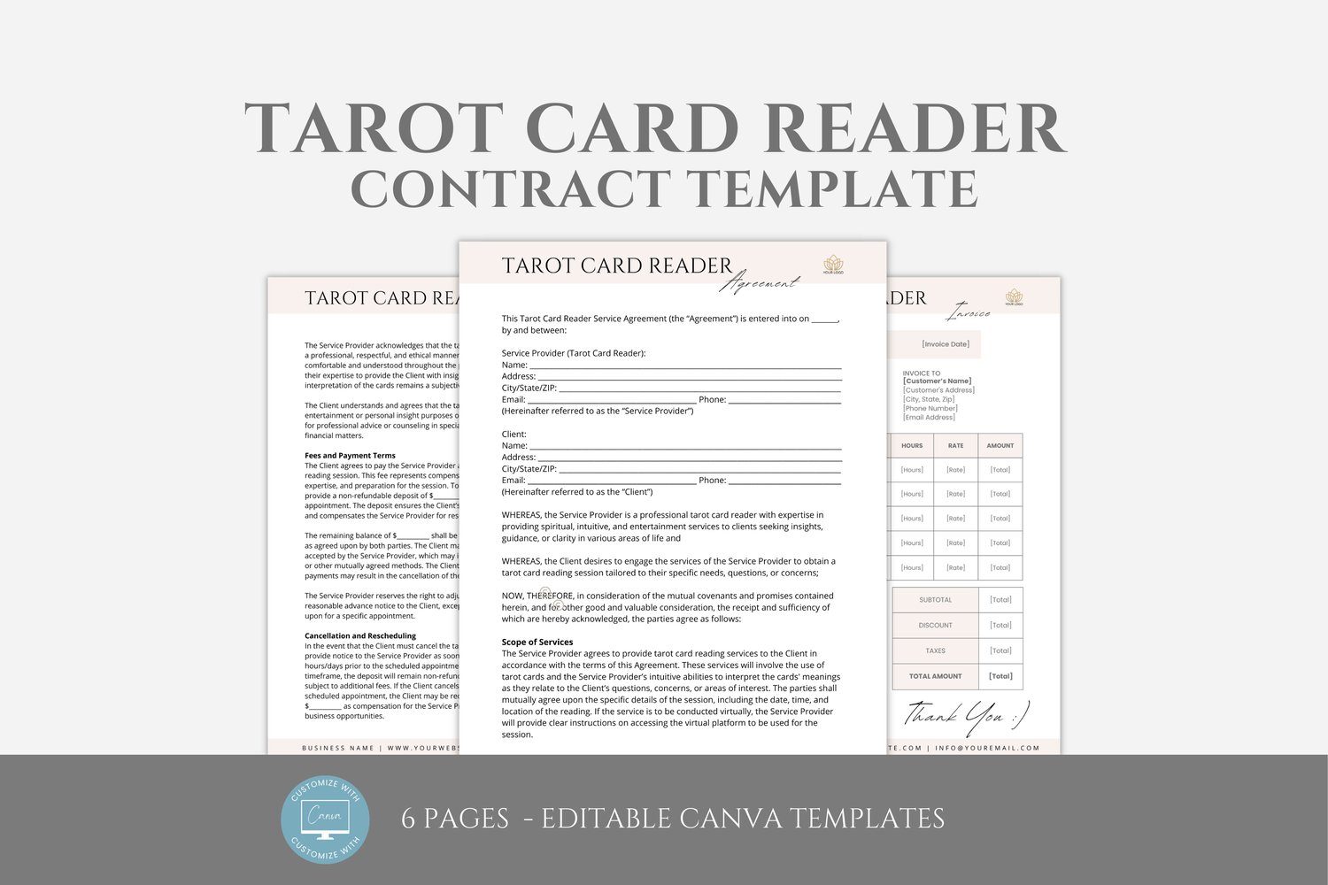 This is a 6-page Tarot Reader Contract Template editable in Canva (FREE Account)! The text is already written for you, but it can also be easily edited in CANVA to add anything particular to your business or area. It is also completely customizable. Text, font, and colors are all fully editable to give you complete control of your branding and create a cohesive look for your business.