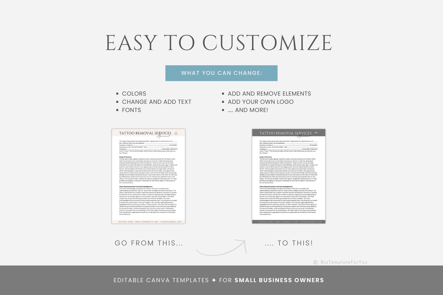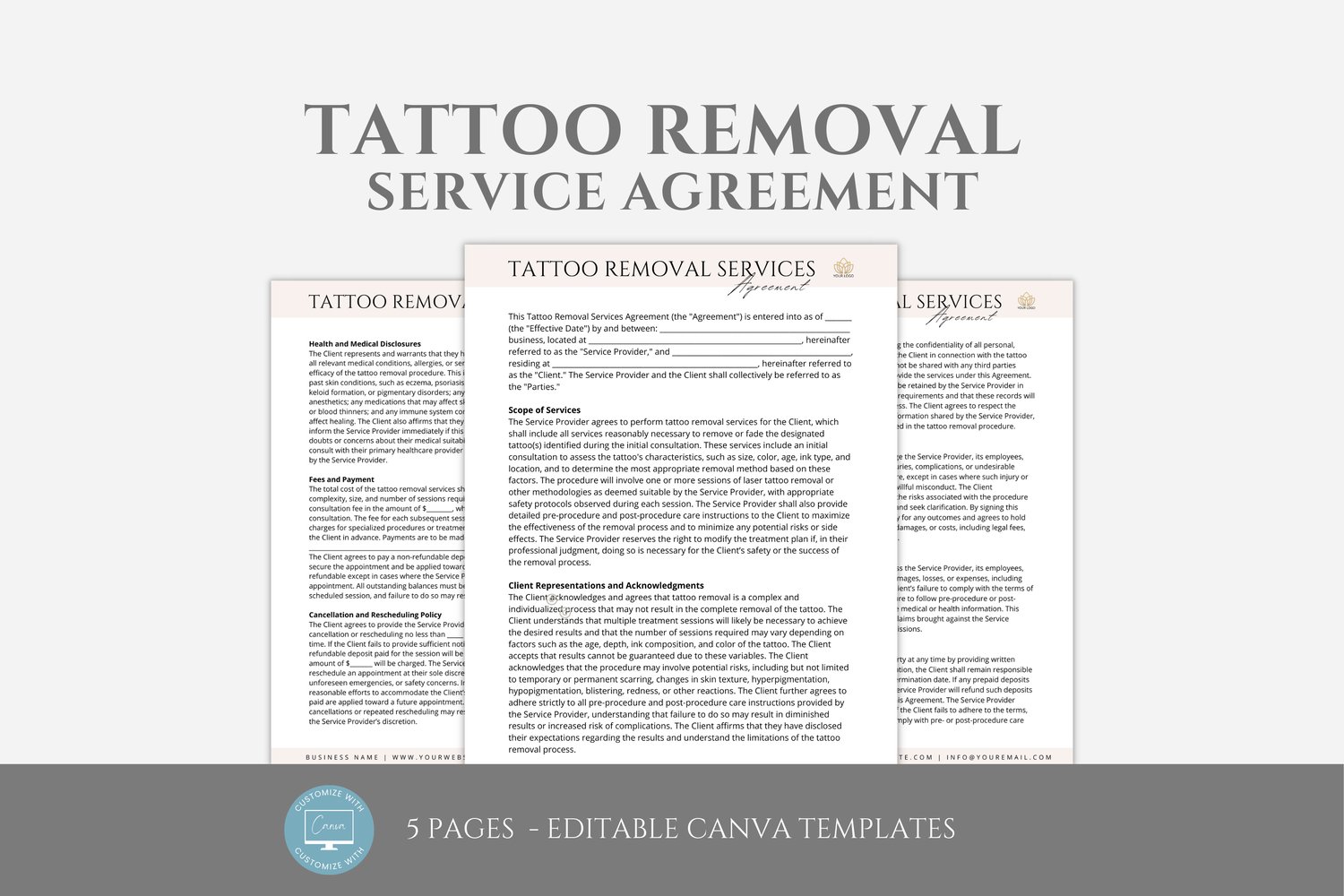 This is a 5-page Tattoo Removal Contract Template editable in Canva (FREE Account)! The text has already been written for you, but it can also be easily edited in CANVA to add anything particular to your business or area. It is also completely customizable. Text, font, and colors are all fully editable to give you complete control of your branding and create a cohesive look for your business.