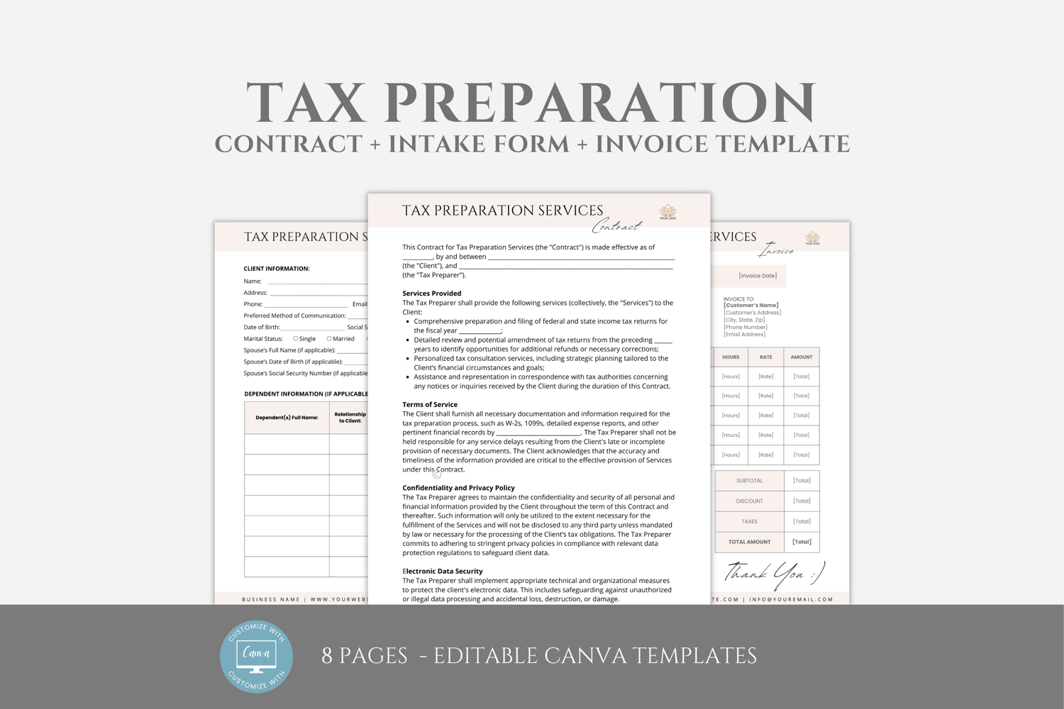 Editable Tax Preparation Contract Template, Freelance Tax Preparer Service Business Forms, Contract and Intake Form Template, Canva editable #6011