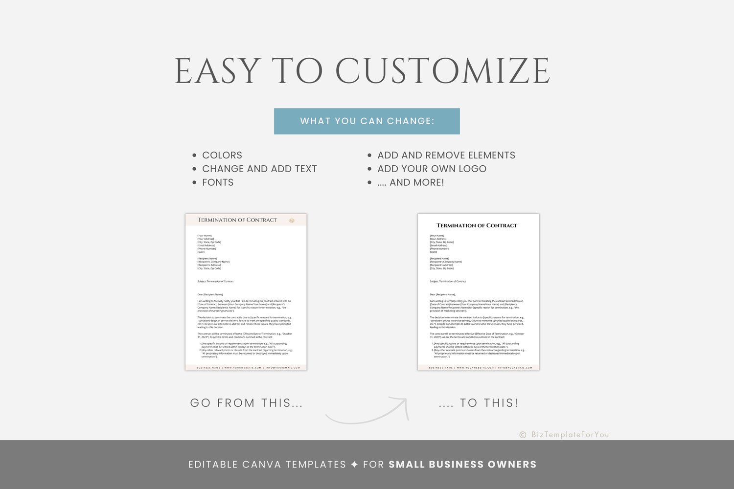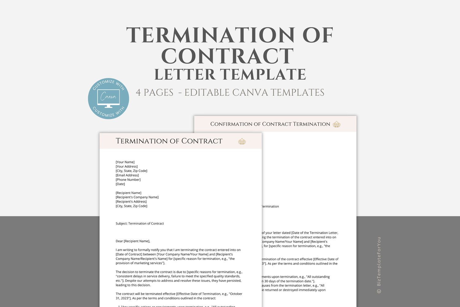 This is a 4-page Termination of Contract Template editable in Canva (FREE Account)! The text is already written for you, but it can also be easily edited in CANVA to add anything particular to your business or area. It is also completely customizable. Text, font, and colors are all fully editable to give you complete control of your branding and create a cohesive look for your business.