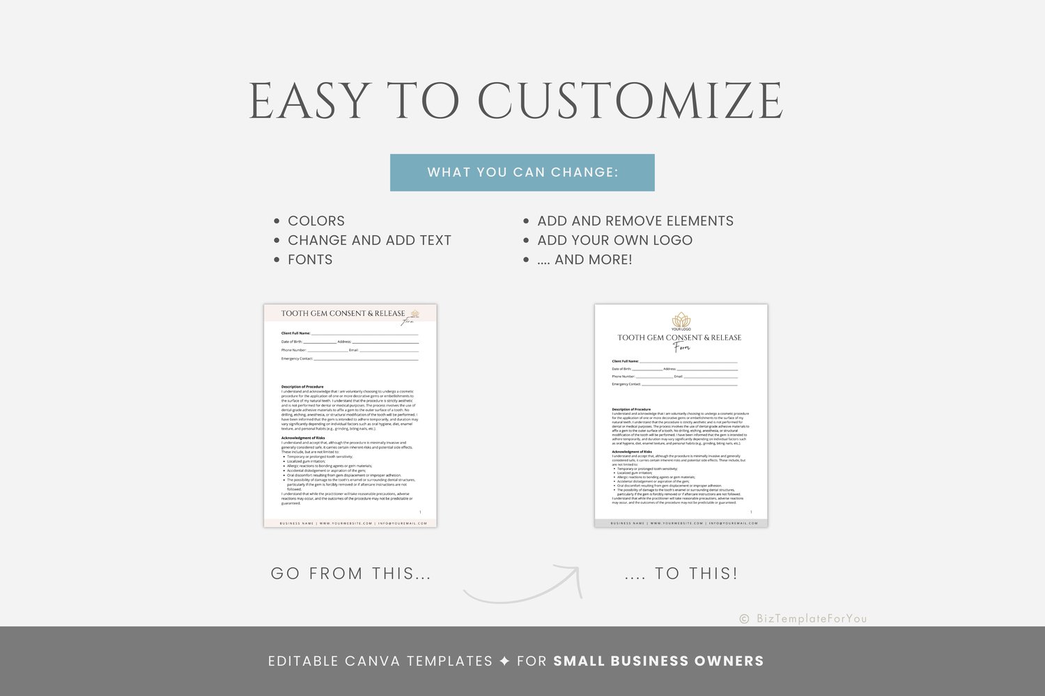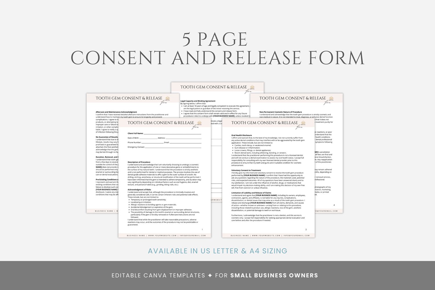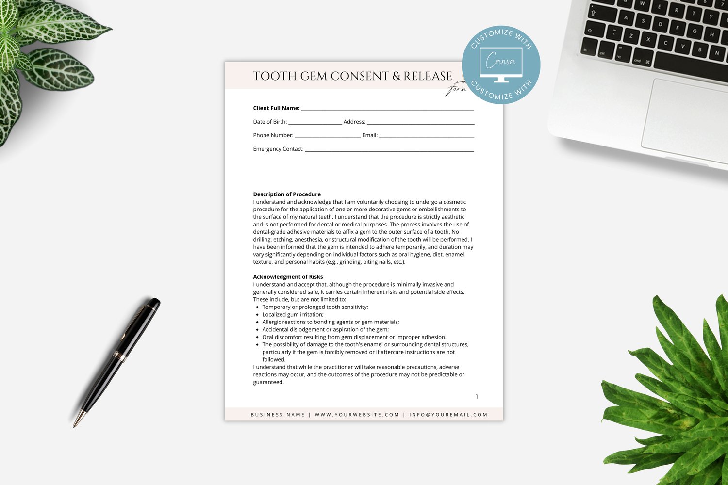 This is a 5-page Tooth Gem Consent Form Template editable in Canva (FREE Account)! The text has already been written for you, but it can also be easily edited in CANVA to add anything particular to your business or area. It is also completely customizable. Text, font, and colors are all fully editable to give you complete control of your branding and create a cohesive look for your business.