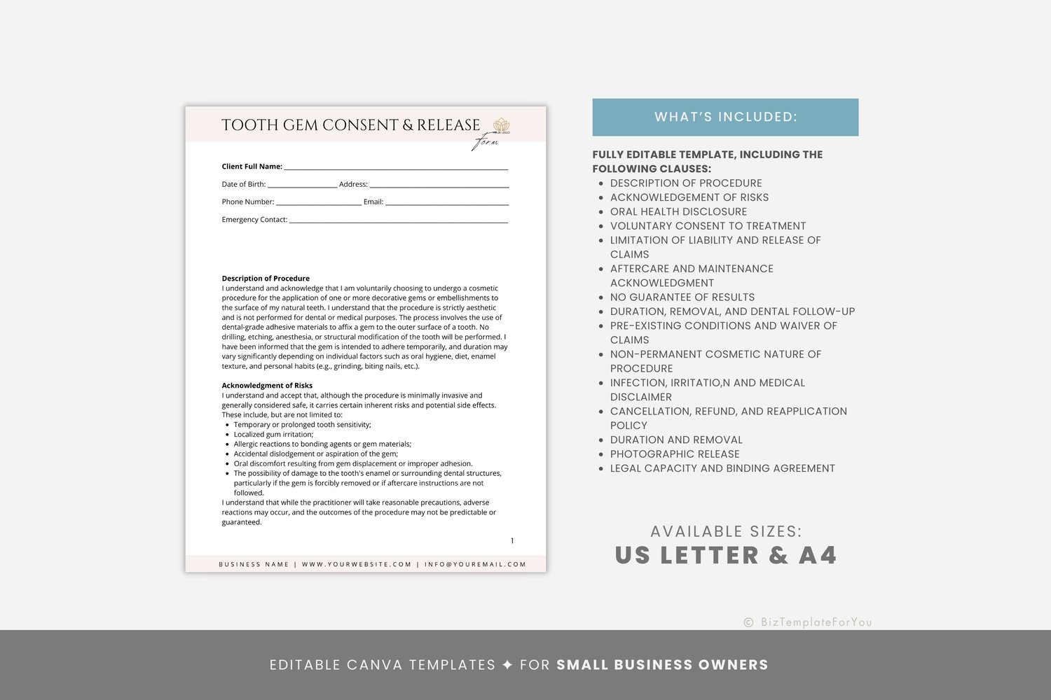 Editable Tooth Gem Consent Form Template, Esthetician Informed Consent, Tooth Gem Waiver Form, Dental Jewel Consent Form, Canva editable #8005
