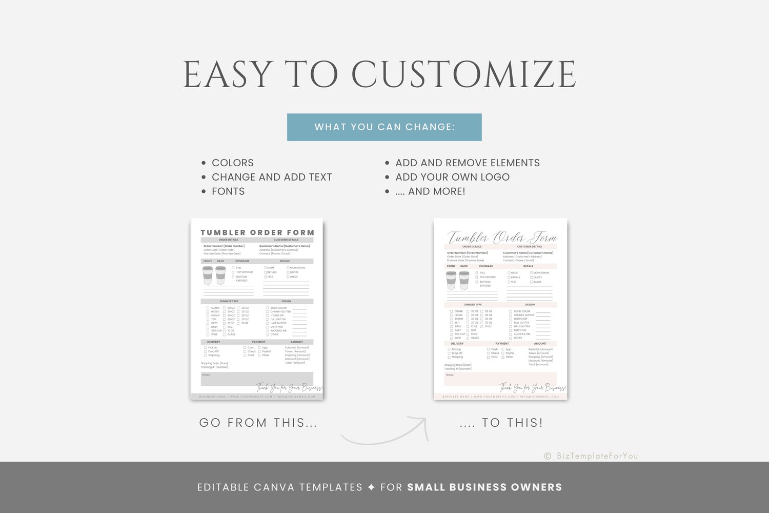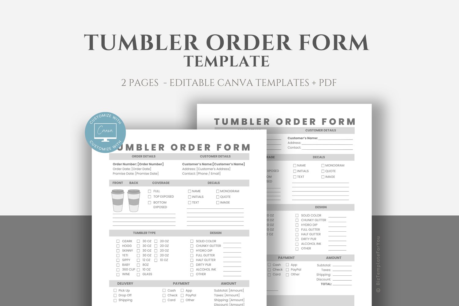 This is a 2-page Tumbler Order Form Template editable in Canva (FREE Account)! The text is already written for you, but it can also be easily edited in CANVA to add anything particular to your business or area. It is also completely customizable. Text, font, and colors are all fully editable to give you complete control of your branding and create a cohesive look for your business.