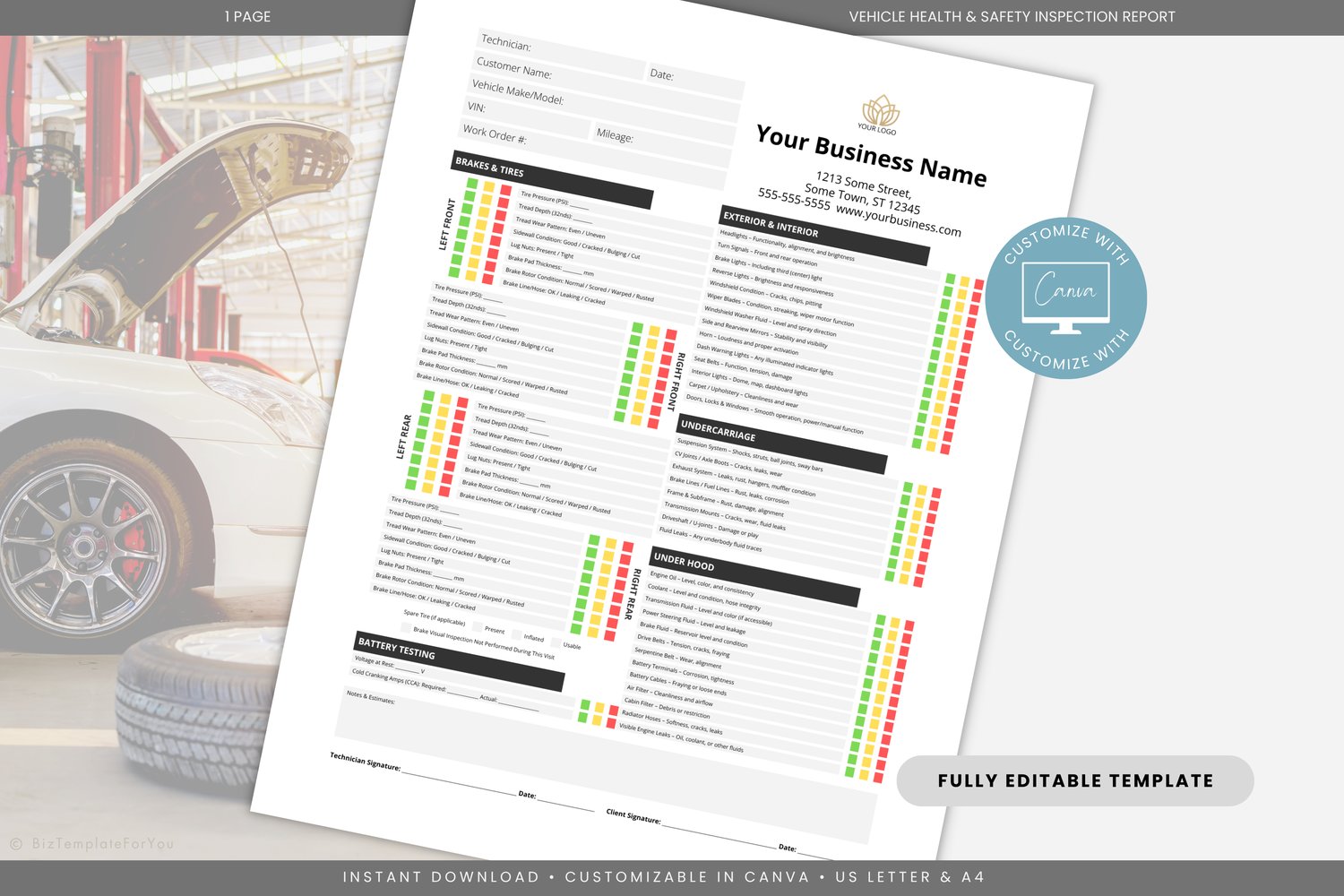 Vehicle Health & Safety Inspection Report Template | Editable Canva Auto Repair Form | Mechanic Vehicle Checklist Printable #8016