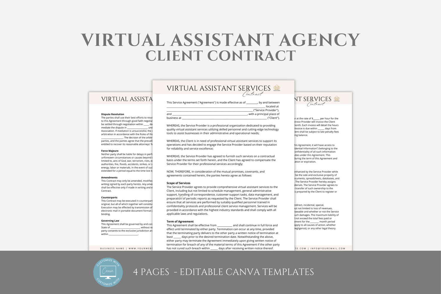 Editable Virtual Assistant Agency Client Contract Template, Service Agreement between the Agency and Client, Canva editable #6028