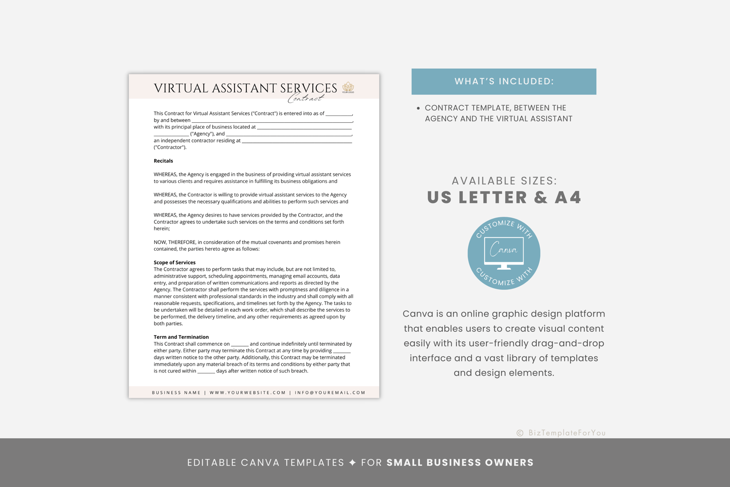 This is a 4-page Virtual Assistant Agency Employment Contract Template editable in Canva (FREE Account)! The text is already written for you, but it is also easily edited in CANVA to add anything particular to your business or area. It is also completely customizable. Text, font, and colors are all fully editable to give you complete control of your branding and create a cohesive look for your business.
