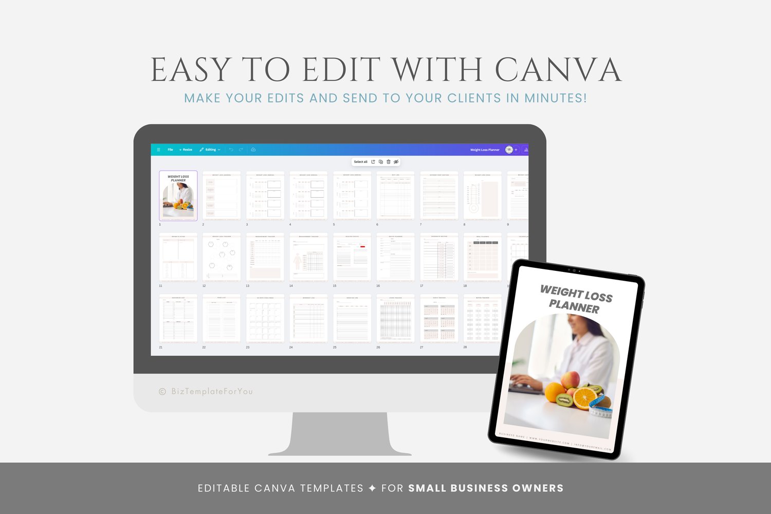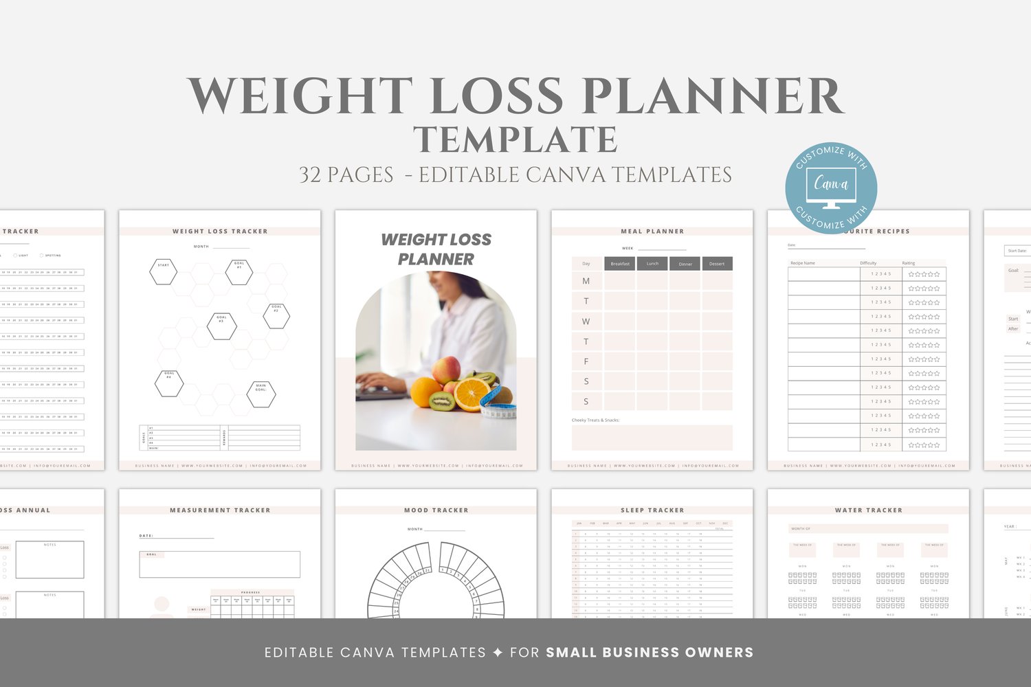 This is a 32-page Weight Loss Planner Template editable in Canva (FREE Account)! The text is already written for you, but it can also be easily edited in CANVA to add anything particular to your business or area. It is also completely customizable. Text, font, and colors are all fully editable to give you complete control of your branding and create a cohesive look for your business.