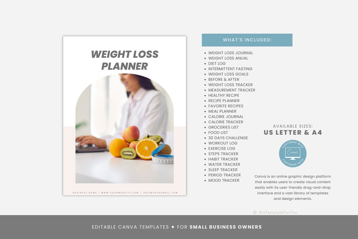 Editable Weight Loss Planner Template, Weight Loss Tracker, Diet Planner, Weight Loss Goal Planner, Personal Trainer, Coach, Canva Template #7037