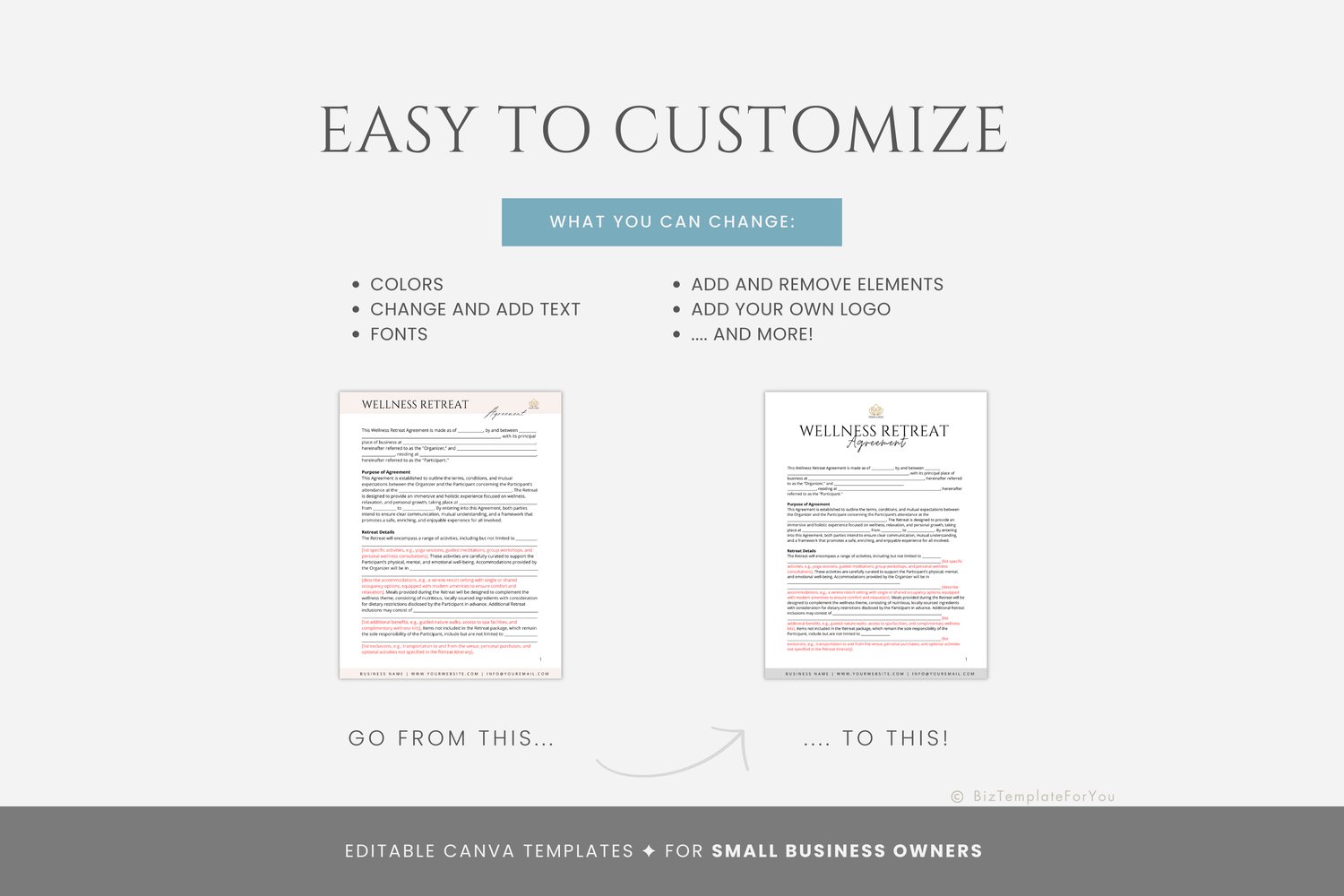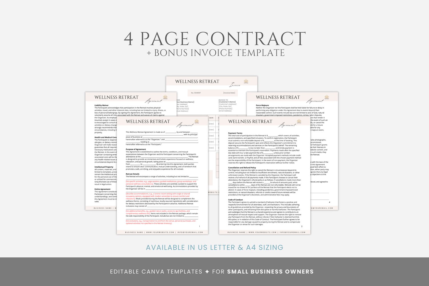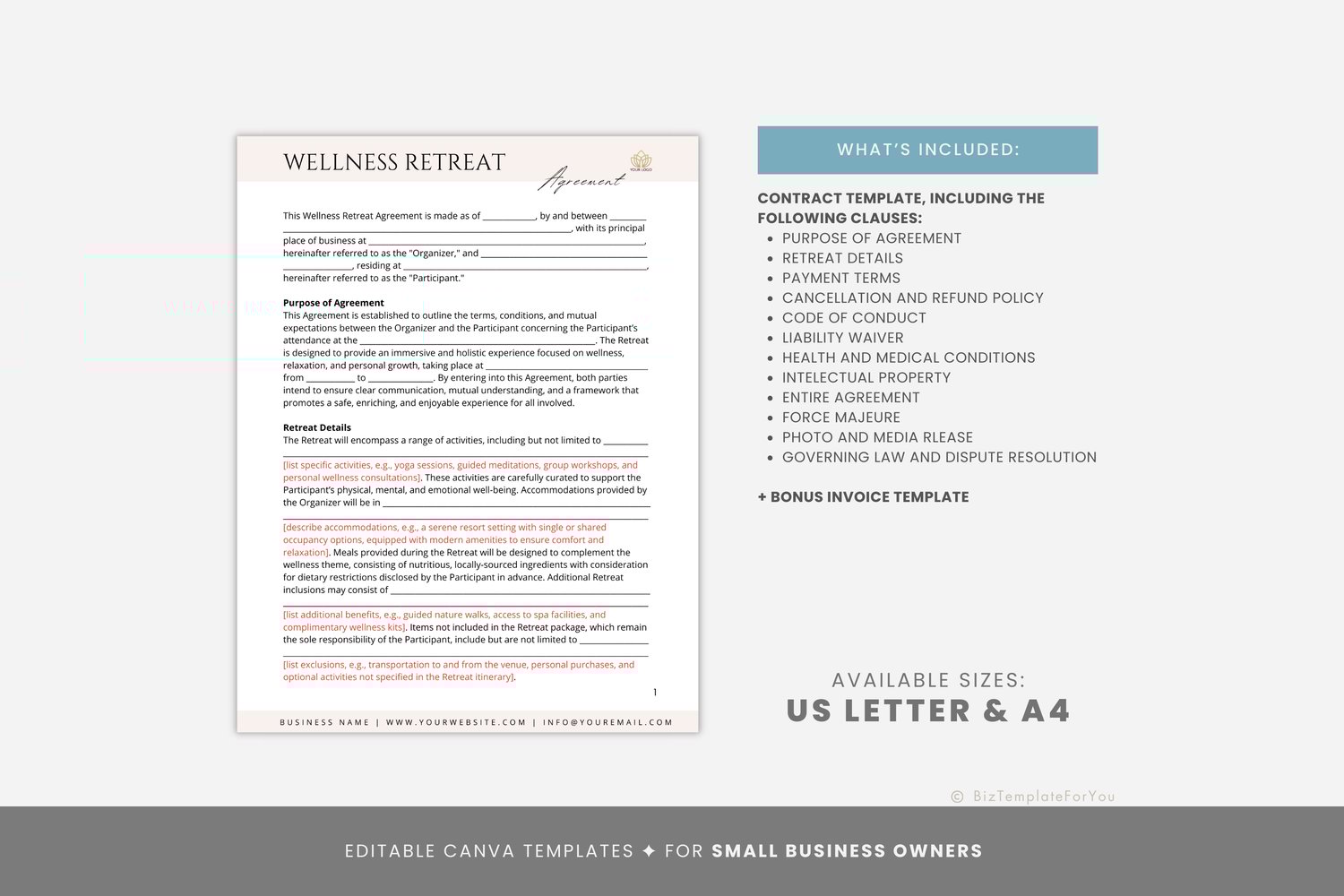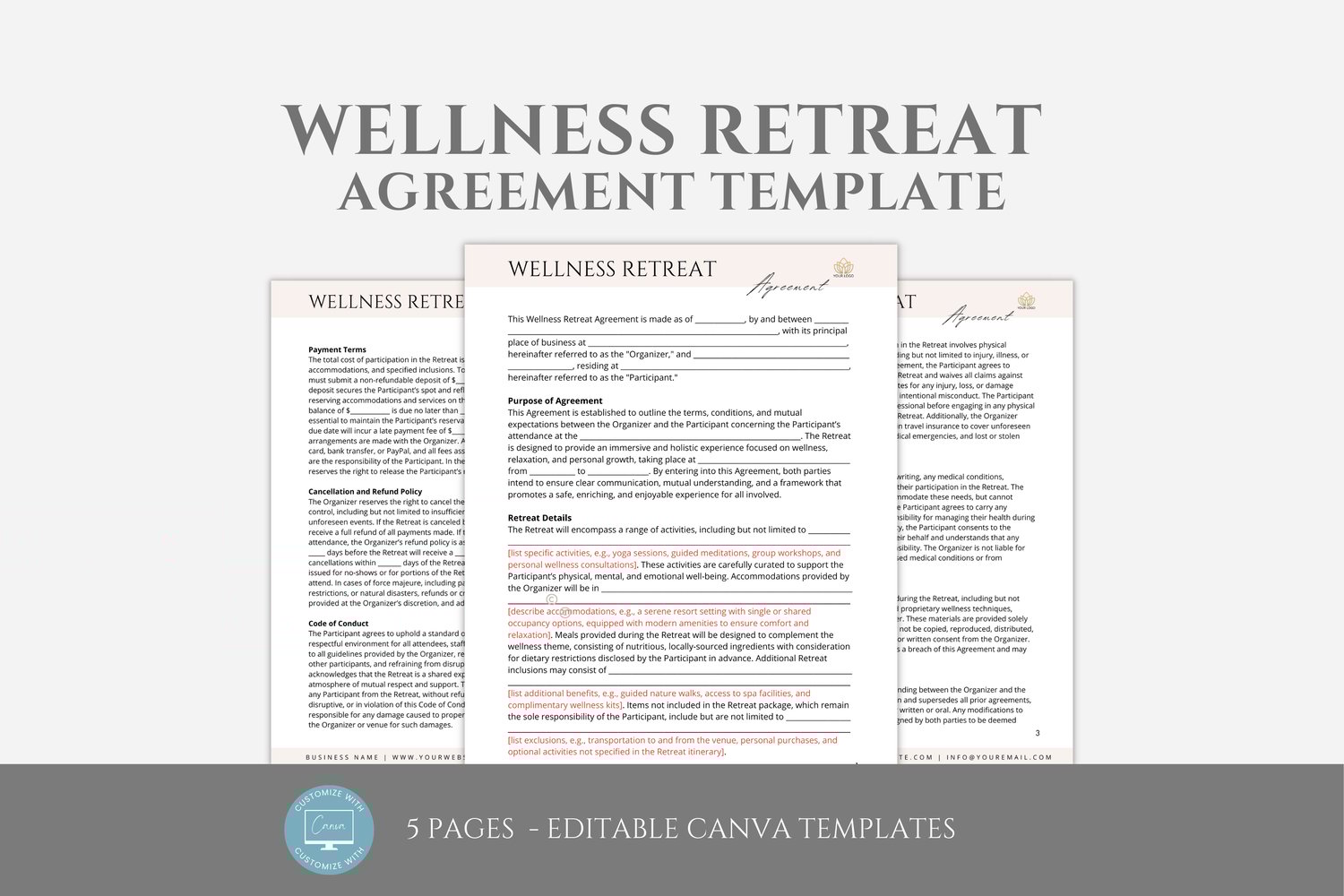 This is a 5-page Wellness Retreat Agreement Template, editable in Canva (FREE Account)! The text is already written for you, but it is also easily edited in CANVA to add anything that is particular to your business or area. It is also completely customizable. Text, font, and colors are all fully editable to give you complete control of your branding and create a cohesive look for your business.