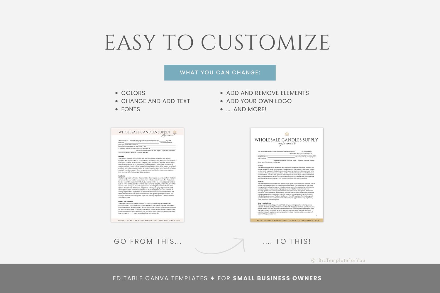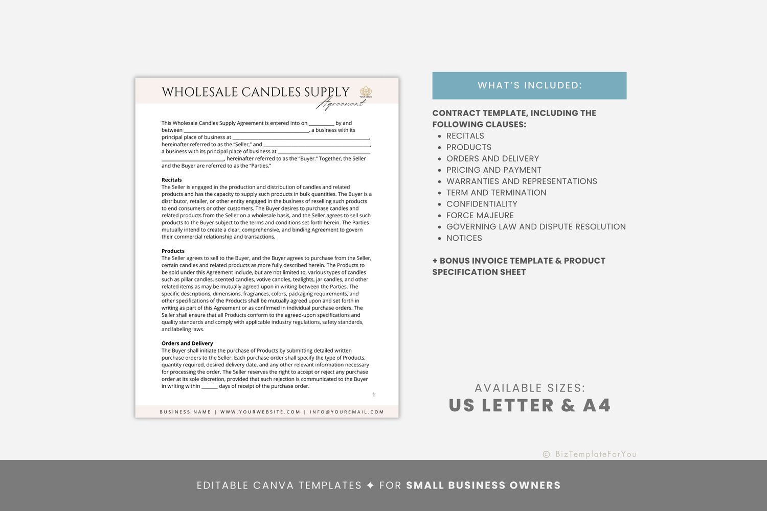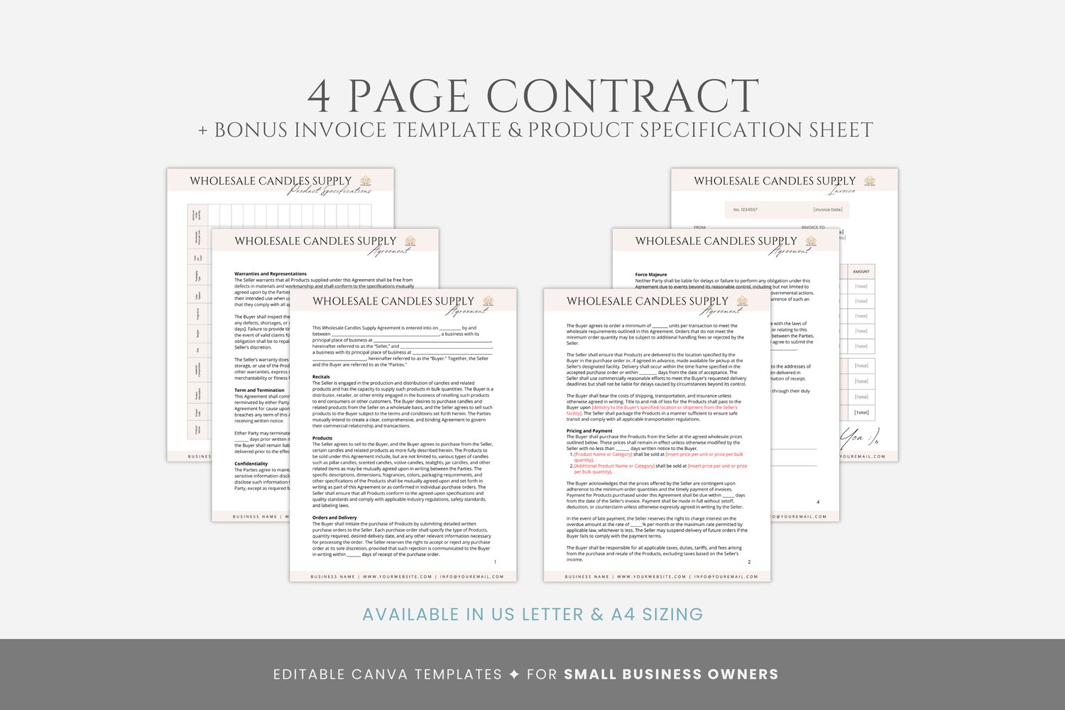 This is a 6-page Wholesale Candles Supply Agreement Template editable in Canva (FREE Account)! The text is already written for you, but it is also easily edited in CANVA to add anything that is particular to your business or area. It is also completely customizable. Text, font, and colors are all fully editable to give you complete control of your branding and create a cohesive look for your business.