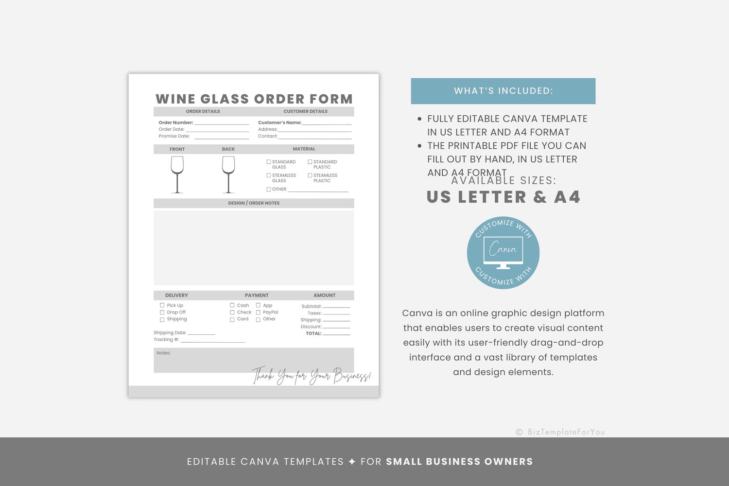 This is a 2-page Wine Glass Order Form Template editable in Canva (FREE Account)! The text is already written for you, but it is also easily edited in CANVA to add anything that is particular to your business or area. It is also completely customizable. Text, font, and colors are all fully editable to give you complete control of your branding and create a cohesive look for your business.