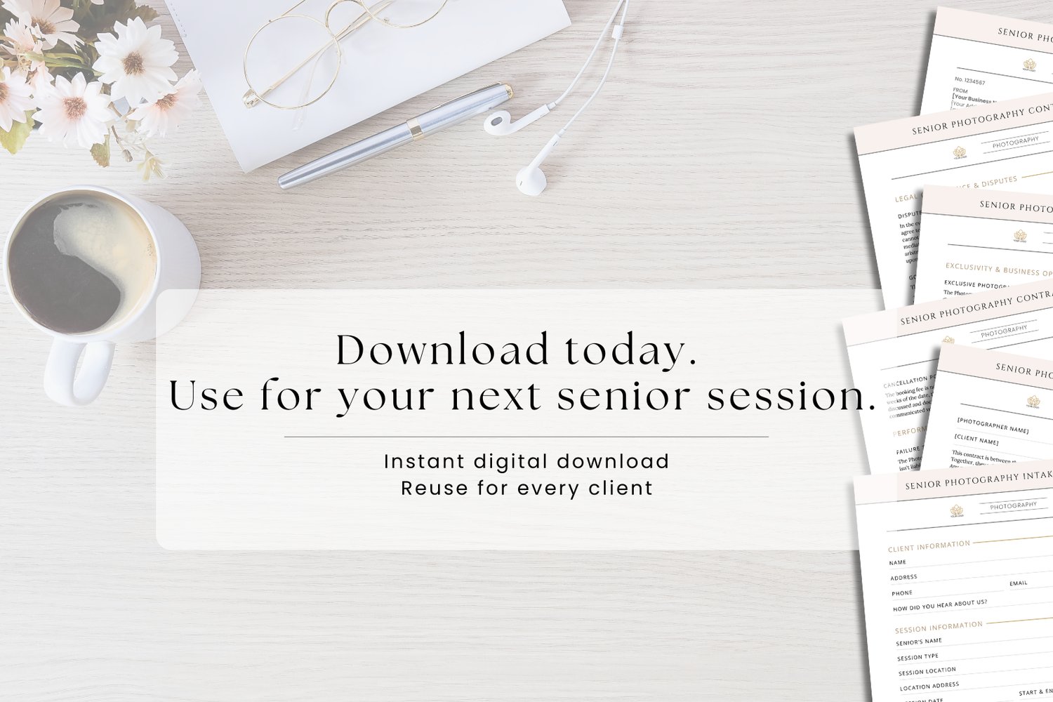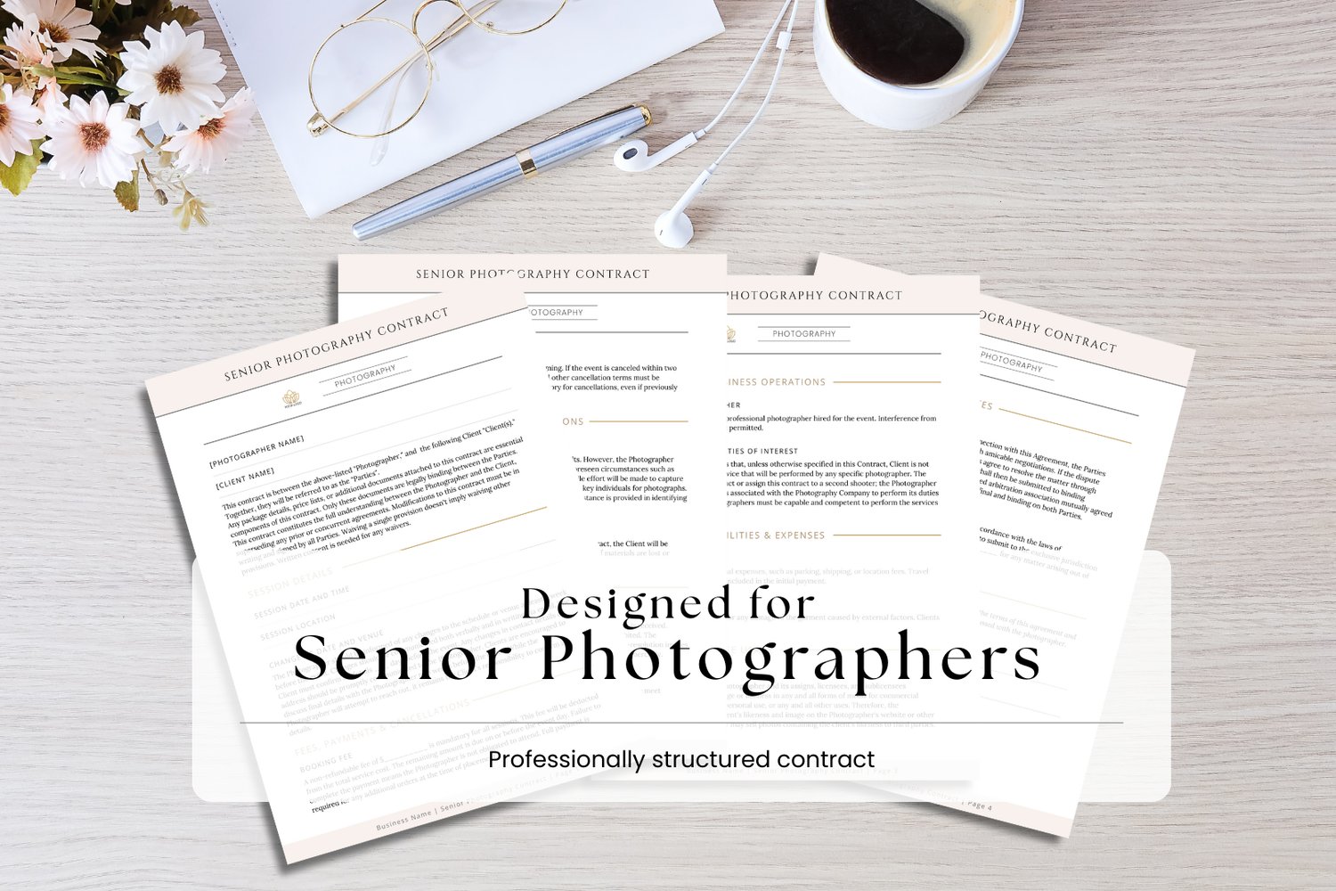 This template is ideal for senior photographers, portrait photographers, and small photography businesses who want a clean, modern contract without having to start from scratch.