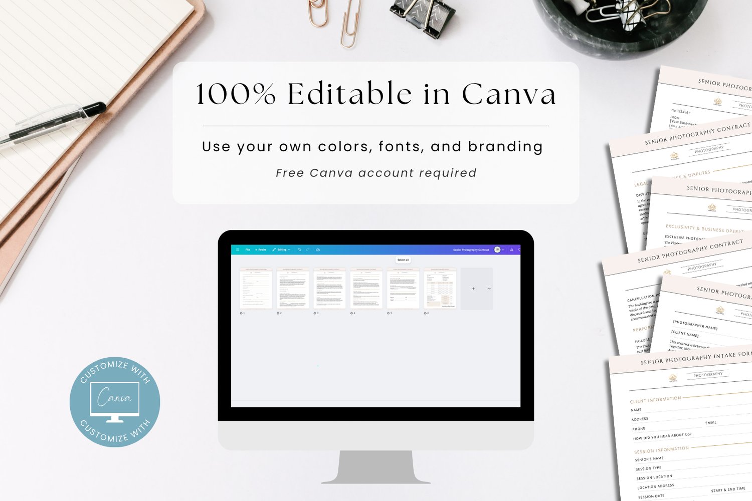 Senior Photography Contract Template | Editable Canva Photography Contract + Intake Form & Invoice | Digital Download #8063